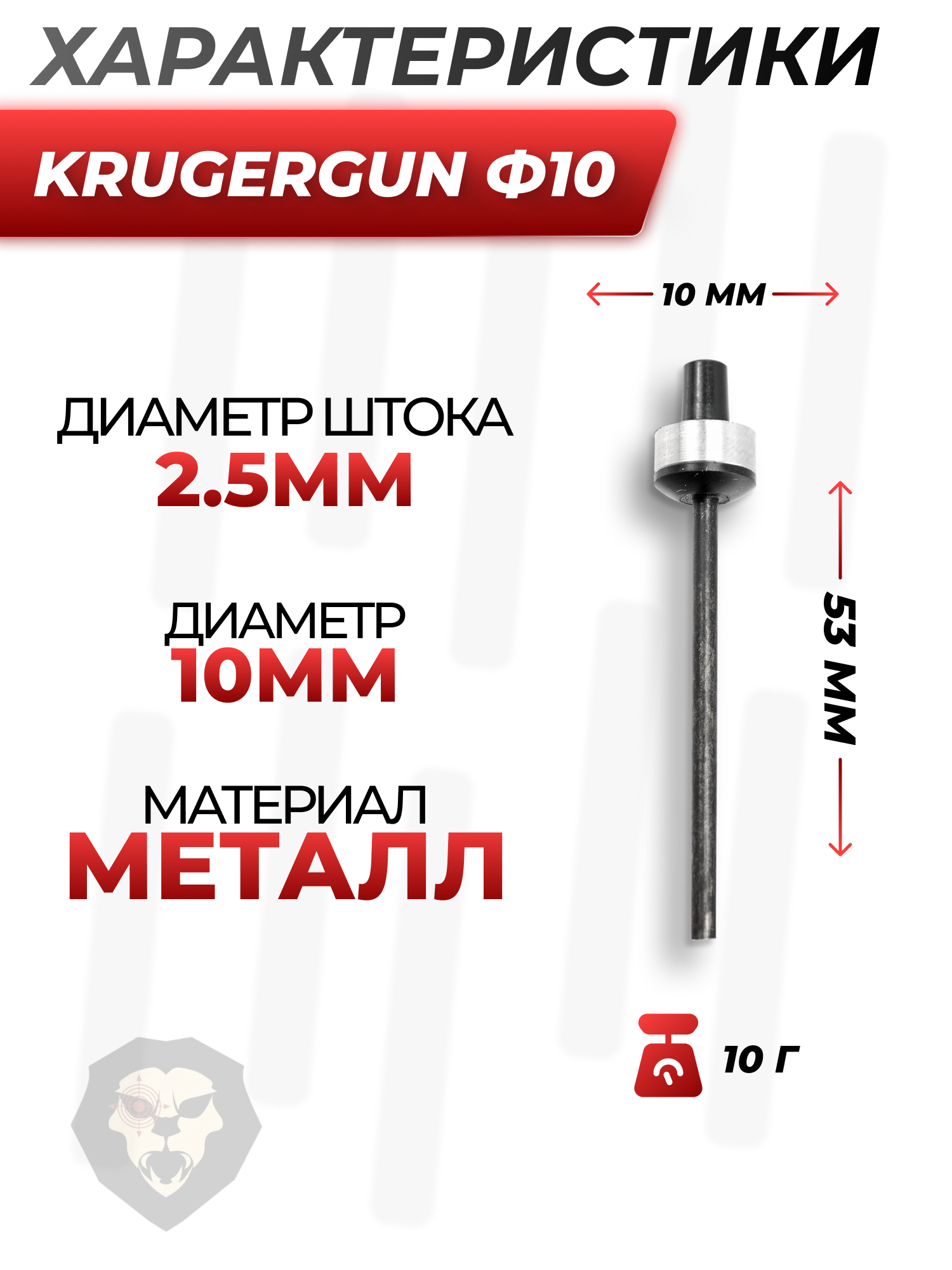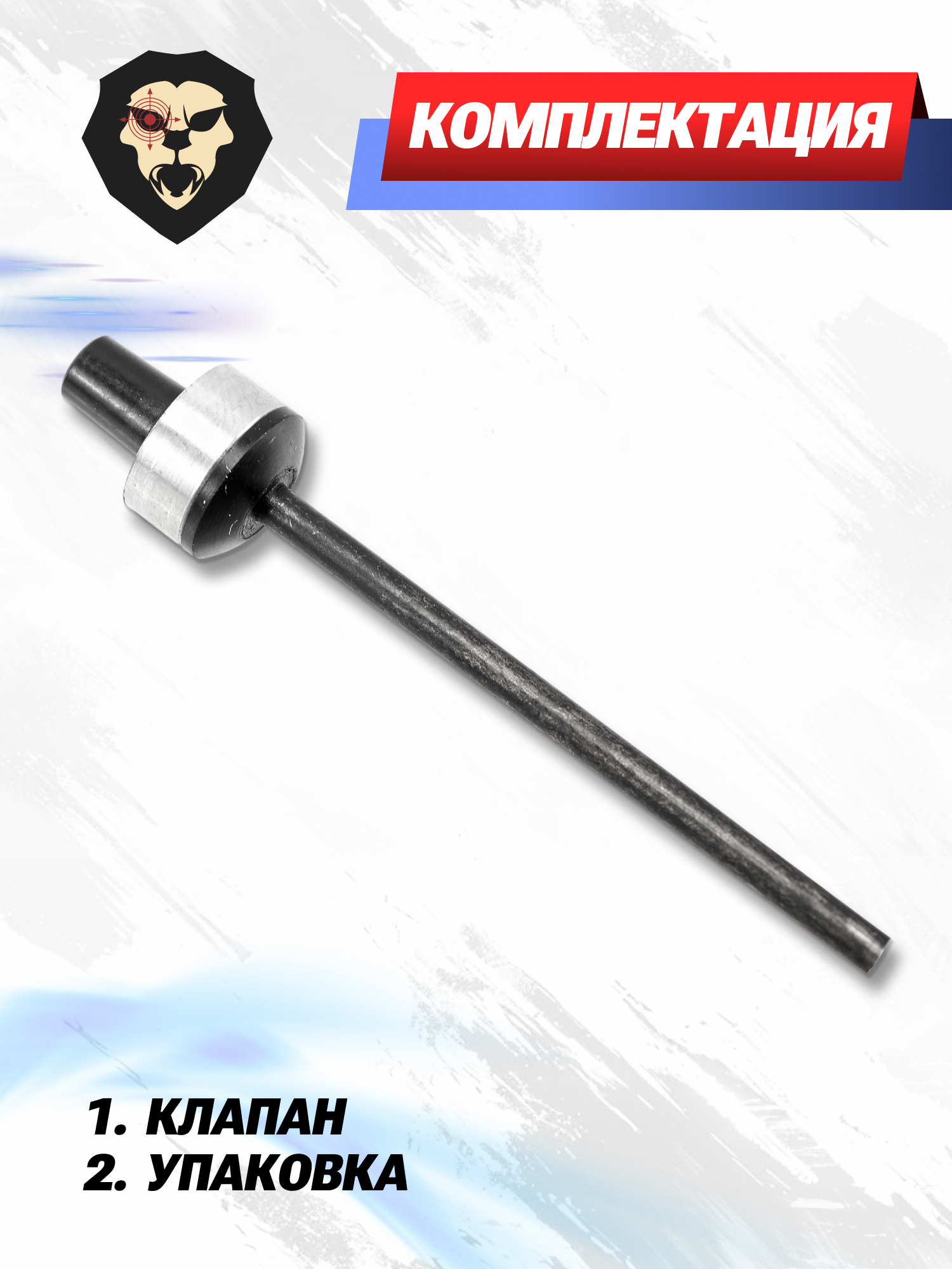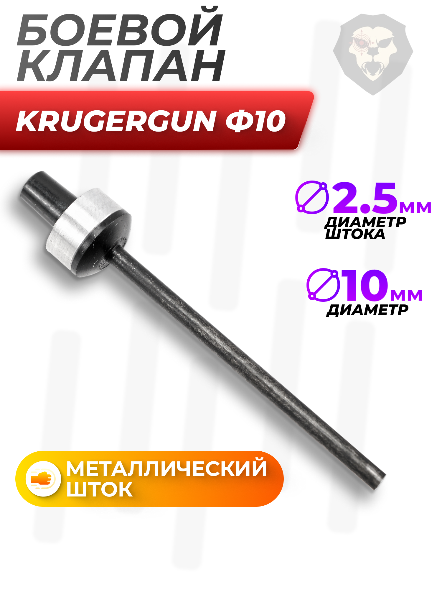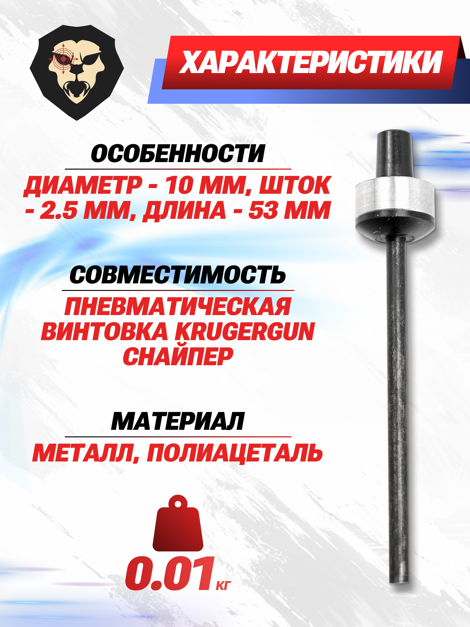 Клапан ресивера винтовки Krugergun состоит из металлического штока и головки - рабочую часть при этом выполнили из полиацеталя. Диаметр последней — 10 миллиметров, а ширина штока — 2.5 мм. Габарит длины в целом — 53 мм, изделие готово к установке по факту приобретения.