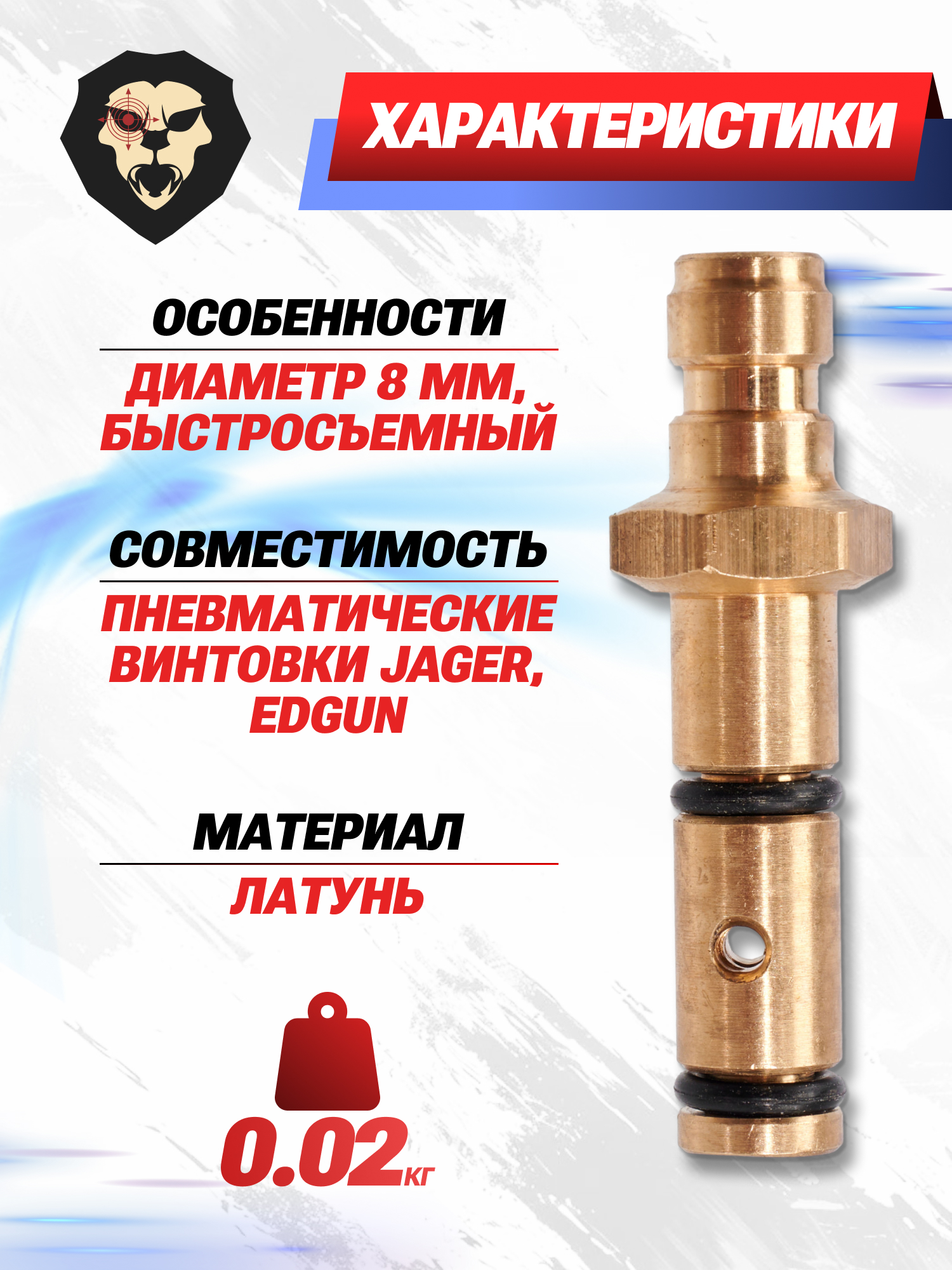 Обозреваемый адаптер Патриот рассчитан на эксплуатацию совместно с ПСП пневматикой Jager и EDgun - диаметр носика составляет 8 миллиметров. Штуцер вытачивается из цельной латунной заготовки. За счет разницы в твердости металла изделие не повреждает заправочное гнездо резервуара винтовок при многократном использовании - кроме прочего, применяемый материал характеризуется повышенной устойчивостью к поражению коррозией.
