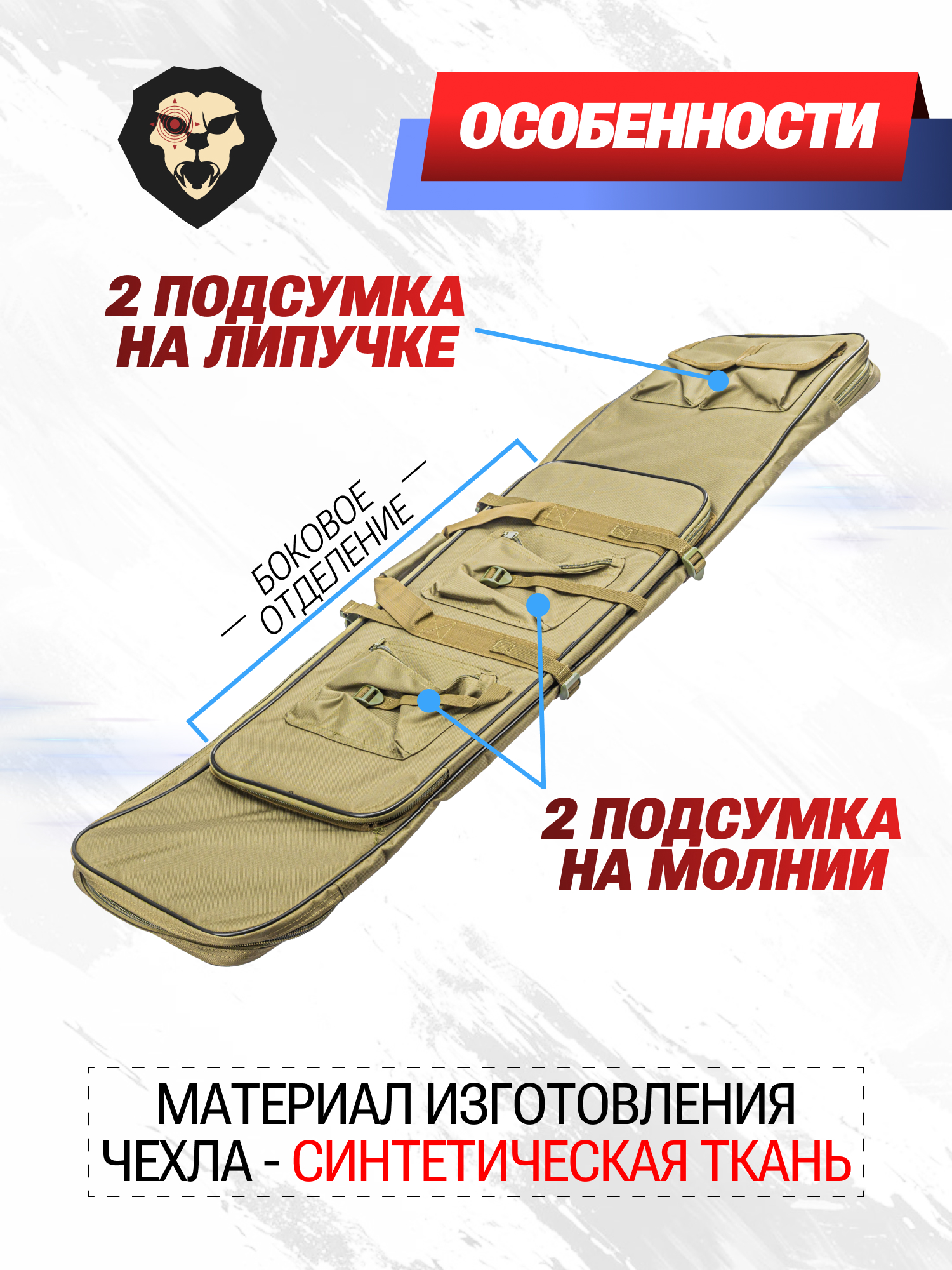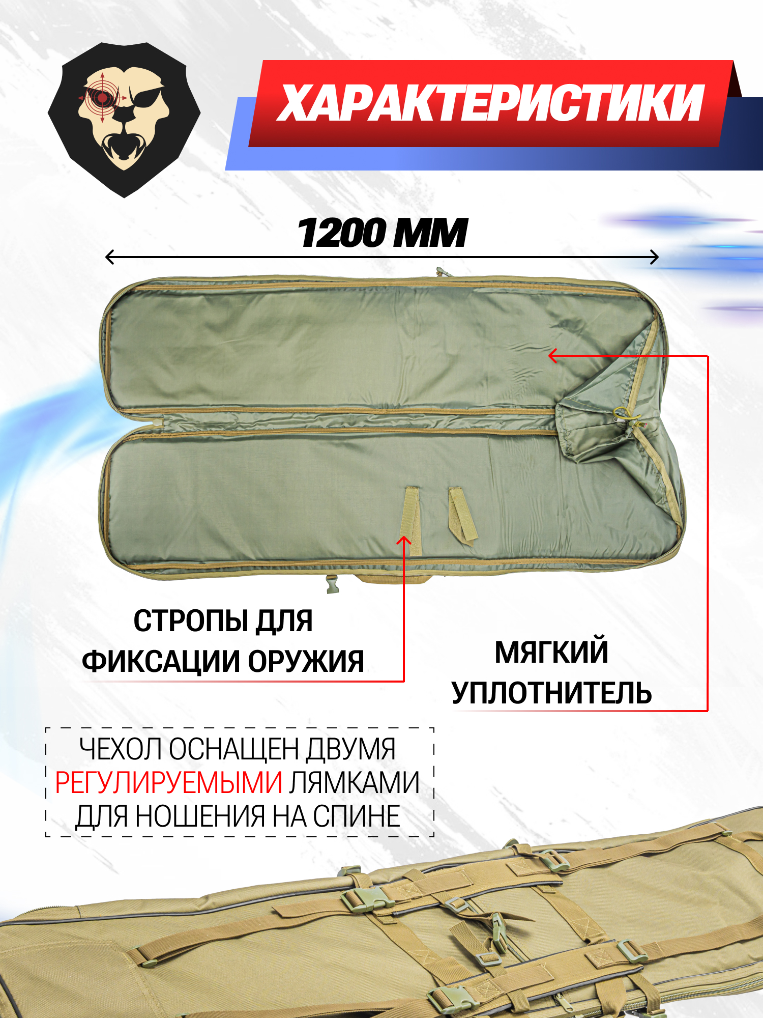 Оружейный чехол раскрывается по принципу «книжки», предоставляя полный доступ к содержимому. Главное отделение рассчитано под огнестрельный карабин или пневматическую винтовку максимальной длиной до 120 сантиметров. При этом габариты футляра допускают размещение стрелковой единицы с оптикой.