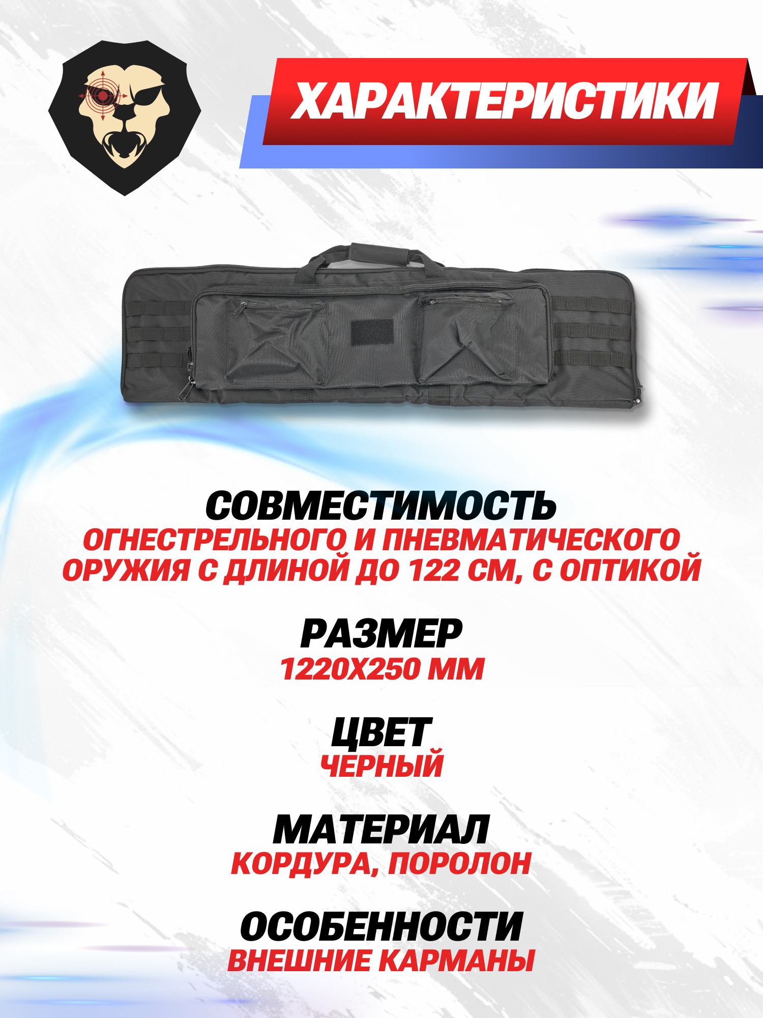 Футляр предназначается для переноски пневматических винтовок и огнестрельных карабинов с прицелом и другим навесным оборудованием. Это стало возможно благодаря прямоугольному форм-фактору чехла с высотой главного отделения 25 сантиметров. В свою очередь длины хватит для транспортировки стрелковых единиц до 122 см вне зависимости от их компоновки.