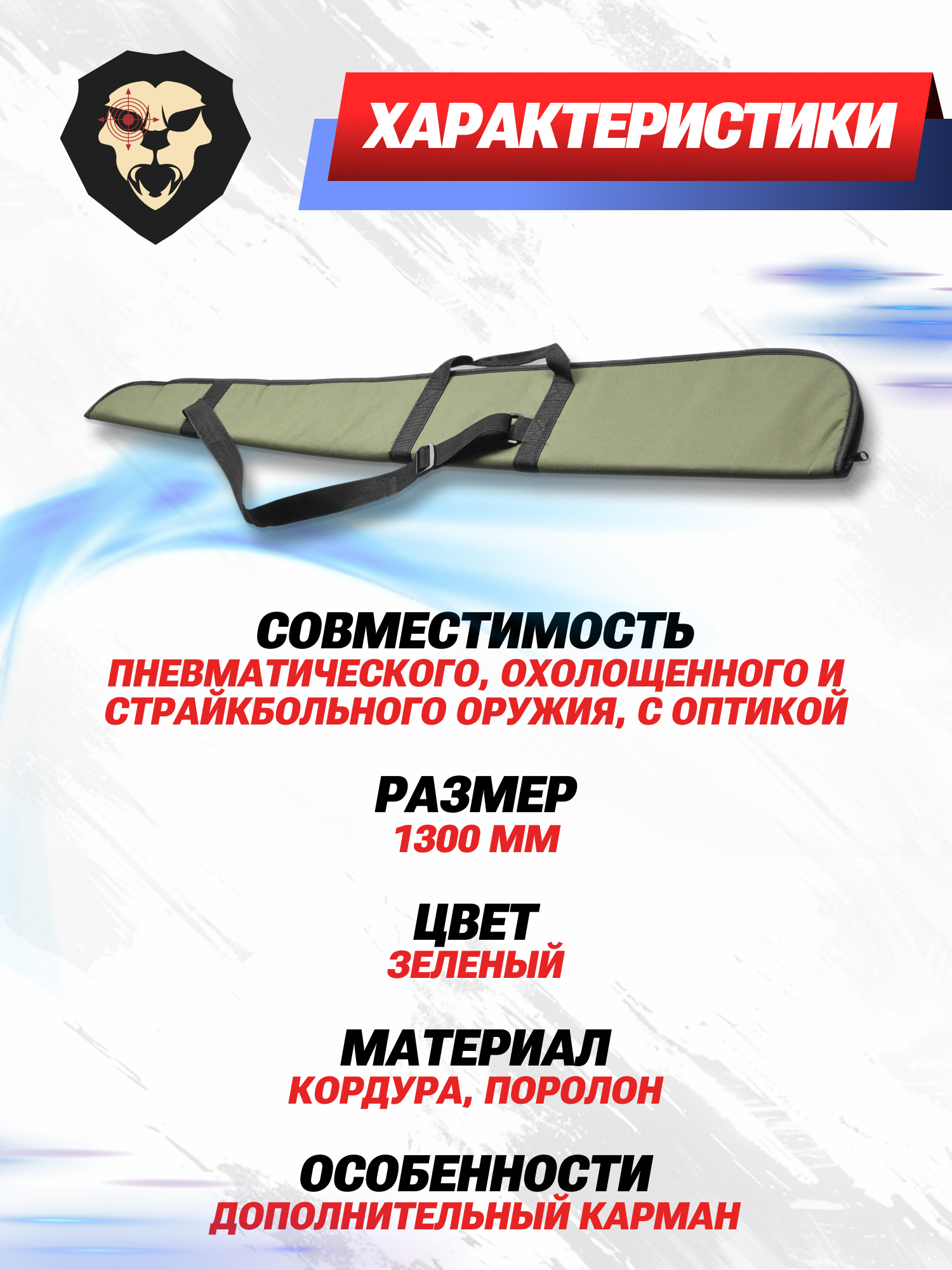 Оружейный чехол 130 см позволяет размещать длинноствольные винтовки и охотничьи дробовики с увеличенным габаритом. Для ношения изделия БХ предусмотрели ремень, а также пару стандартных ручек.