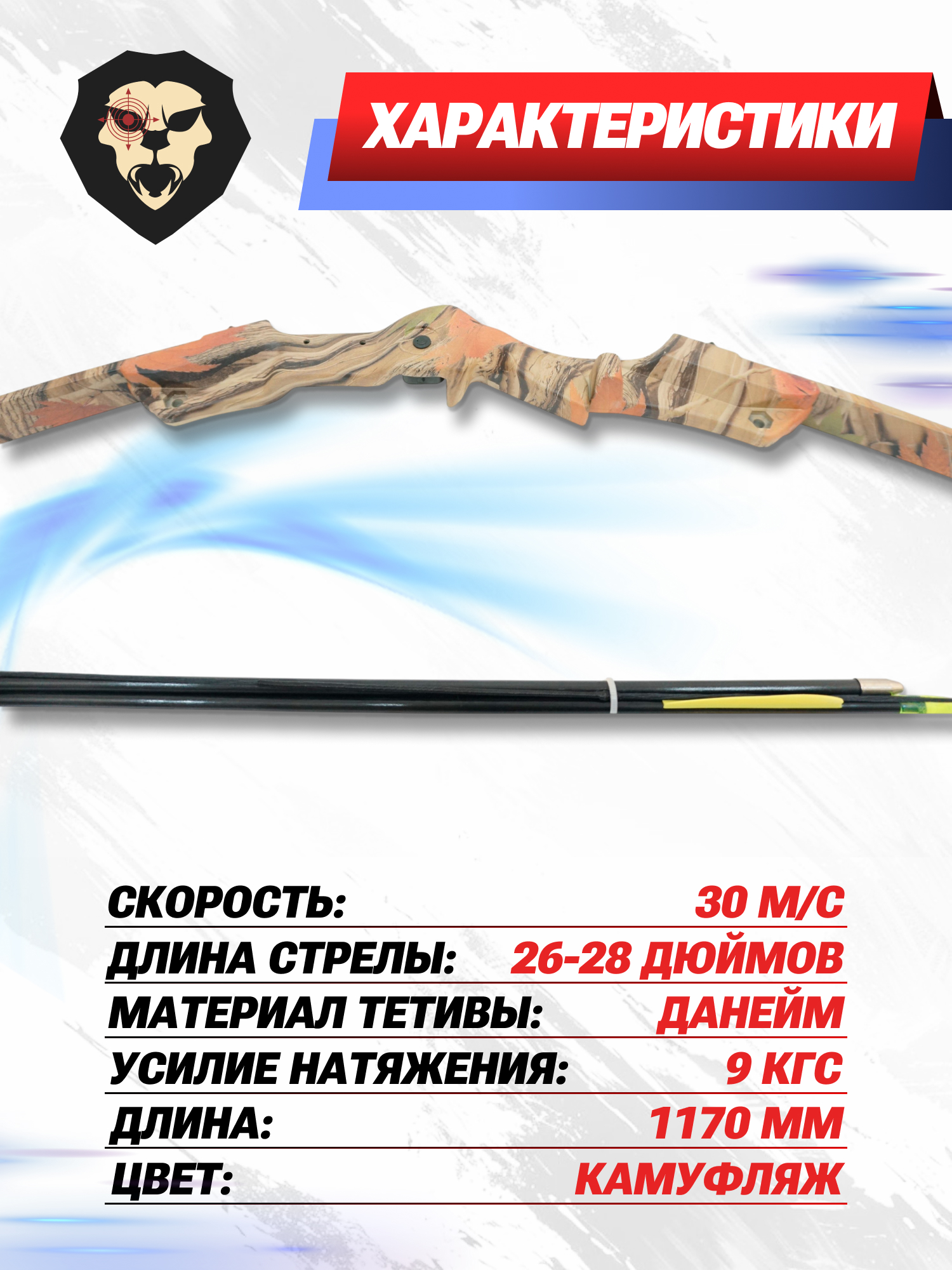 | Комплектация | Лук, стрела - 2 шт, кивер, крага, напальчник, прицел, упаковка |