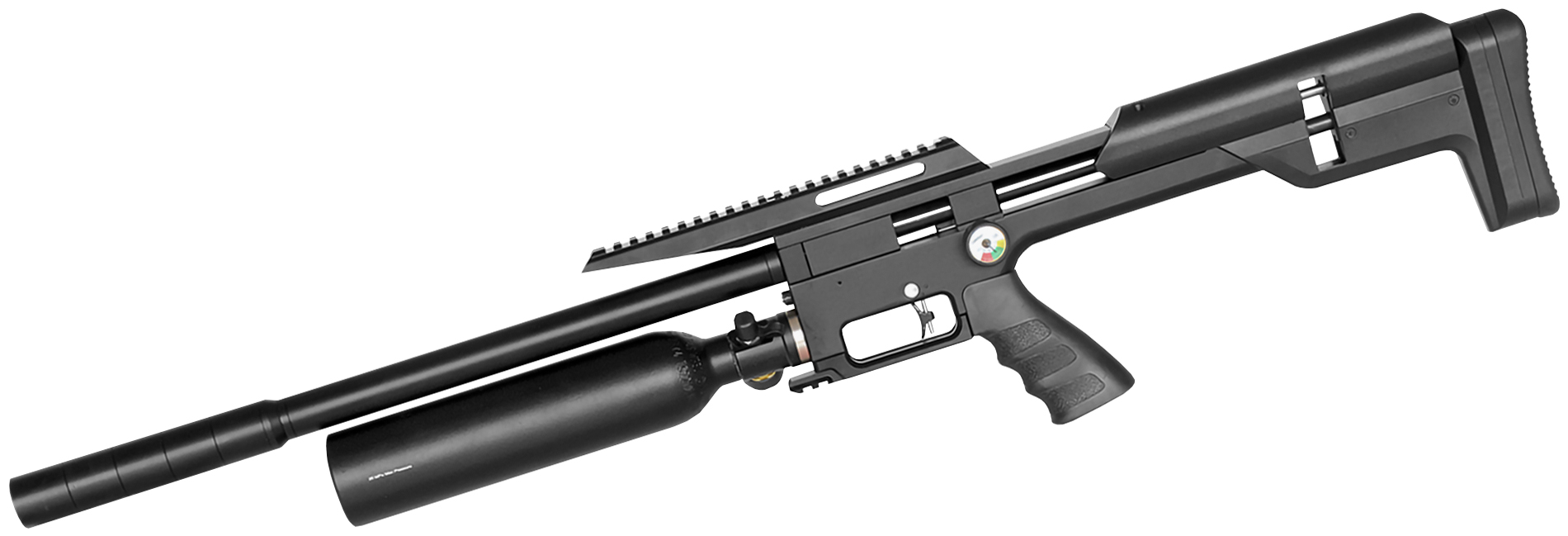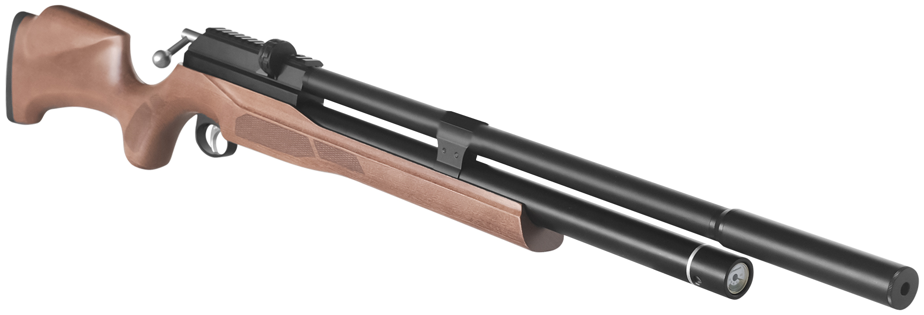 Говоря о форм-факторе резервуара, нельзя не упомянуть третий тип, при котором емкость под воздух выполнена в виде кожуха ствола. Подобная конструкция реализована в винтовках серии M30. Коаксиальное хранилище делает пневматику больше похожей на классические огнестрельные «болтовки» без привычного модуля, интегрированного под бланк.
