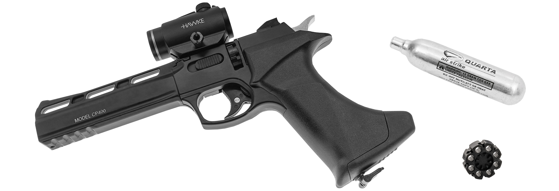 Кроме прочего, приоритетным направлением развития фирмы стала категория CO2 пневматики, которая включает знакомые многим, проверенные образцы по типу CP400. Во внешнем виде прослеживается явное сходство с «Корнетом», не требующим представления. Доступная модель в своей «реинкарнации» сохранила надежный принцип работы прототипа самовзводом или с предварительным смещением внешнего курка - вдобавок предусмотрен кнопочный предохранитель, интегрированный в спуск.