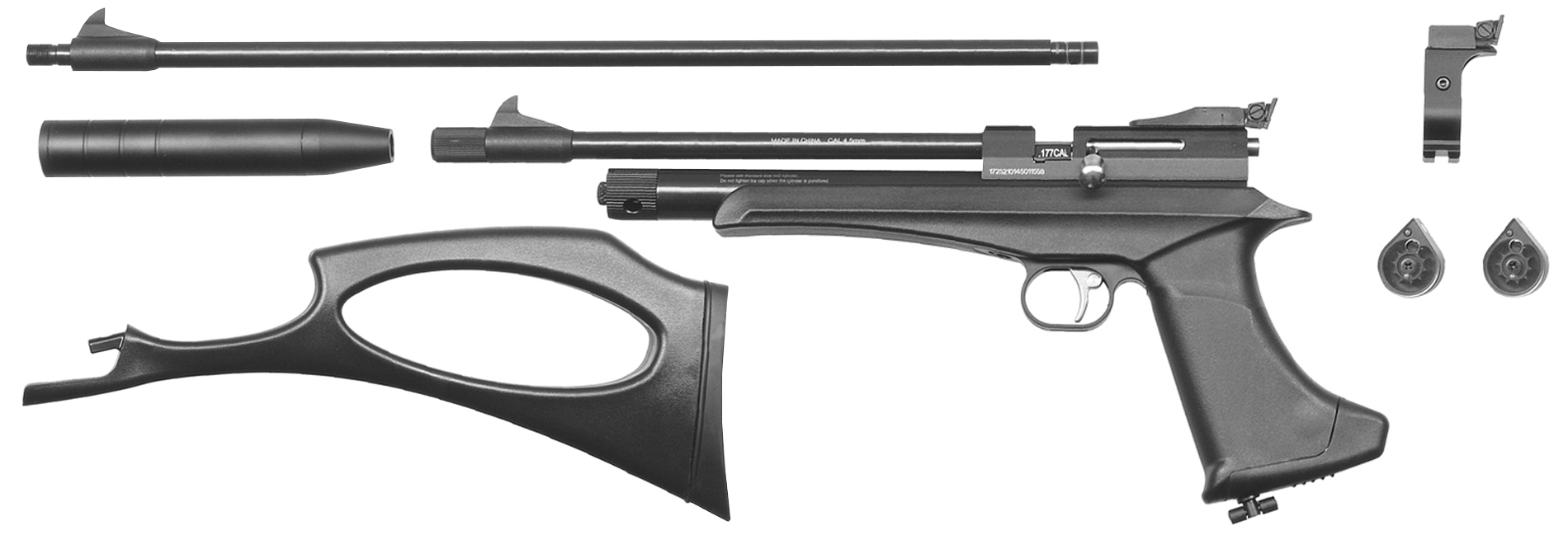 Если в предыдущем случае углекислотный 12-граммовый баллончик помещается в нишу рукояти под съемной пластиковой накладкой, то пневматический пистолет ZR Arms CP2 предполагает загрузку сменного резервуара CO2 внутрь трубчатого отделения под стволом, из-за чего на первый взгляд его легко спутать с ПСП. Экземпляр отличает модульная конфигурация с функцией замены штатного 208 мм ствола удлиненным вариантом на 450 мм, а возможность присоединения приклада одним винтом с барашком со стороны пятки ручки позволяет оперативно повысить точность наведения в полевых условиях без инструмента.