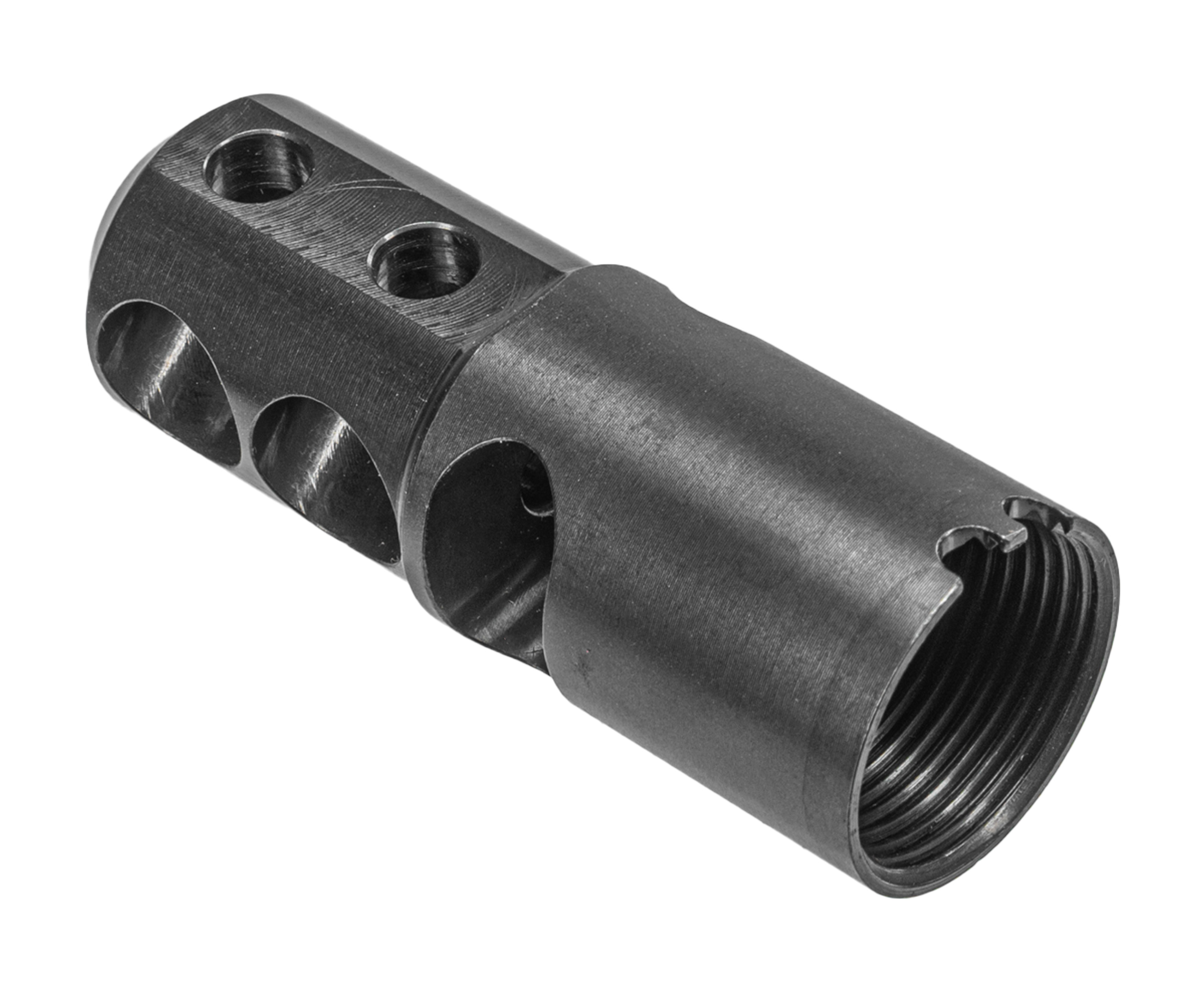 Дульный тормоз вытачивается из высококачественной стали с воронением поверхности, повышающим устойчивость металла к воздействию коррозии. Габариты изделия составляют 71x25.5 мм. Масса приспособления при этом не превышает 97 граммов - учитывая укороченный размер и малый вес, насадка оказывает минимальное влияние не эргономику оружия после установки.