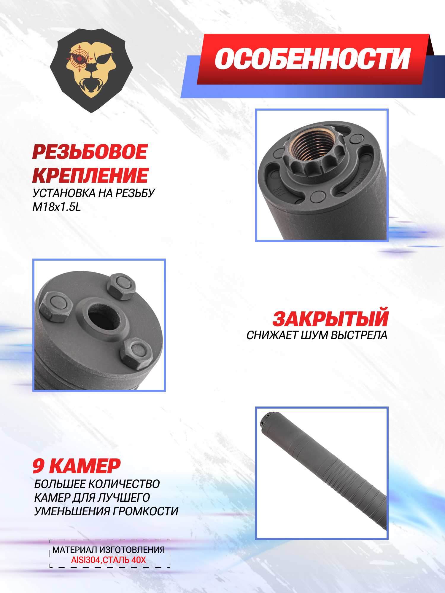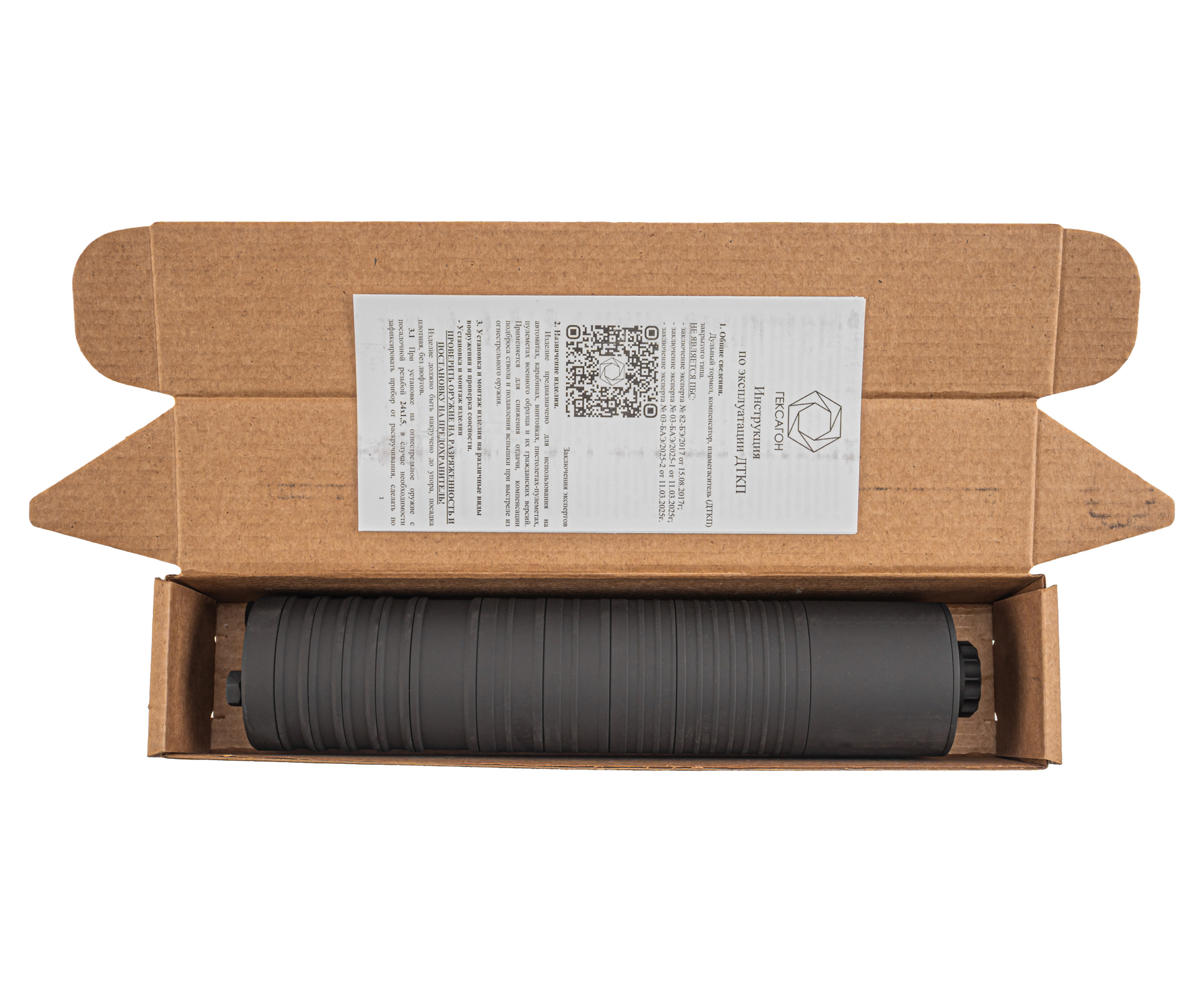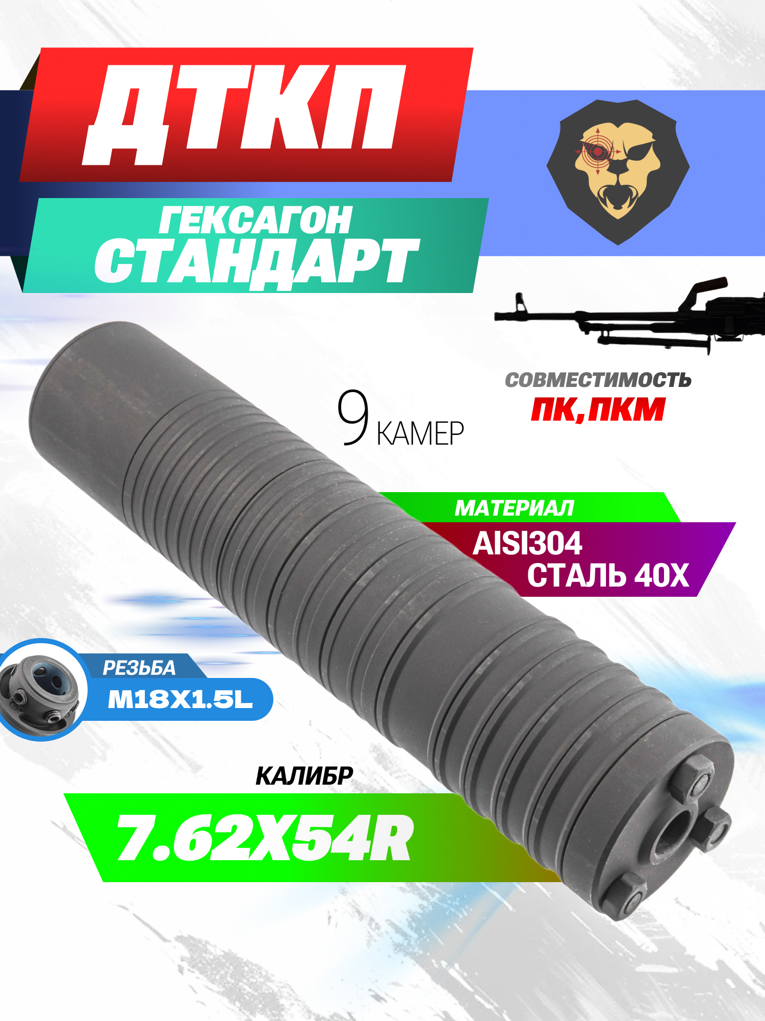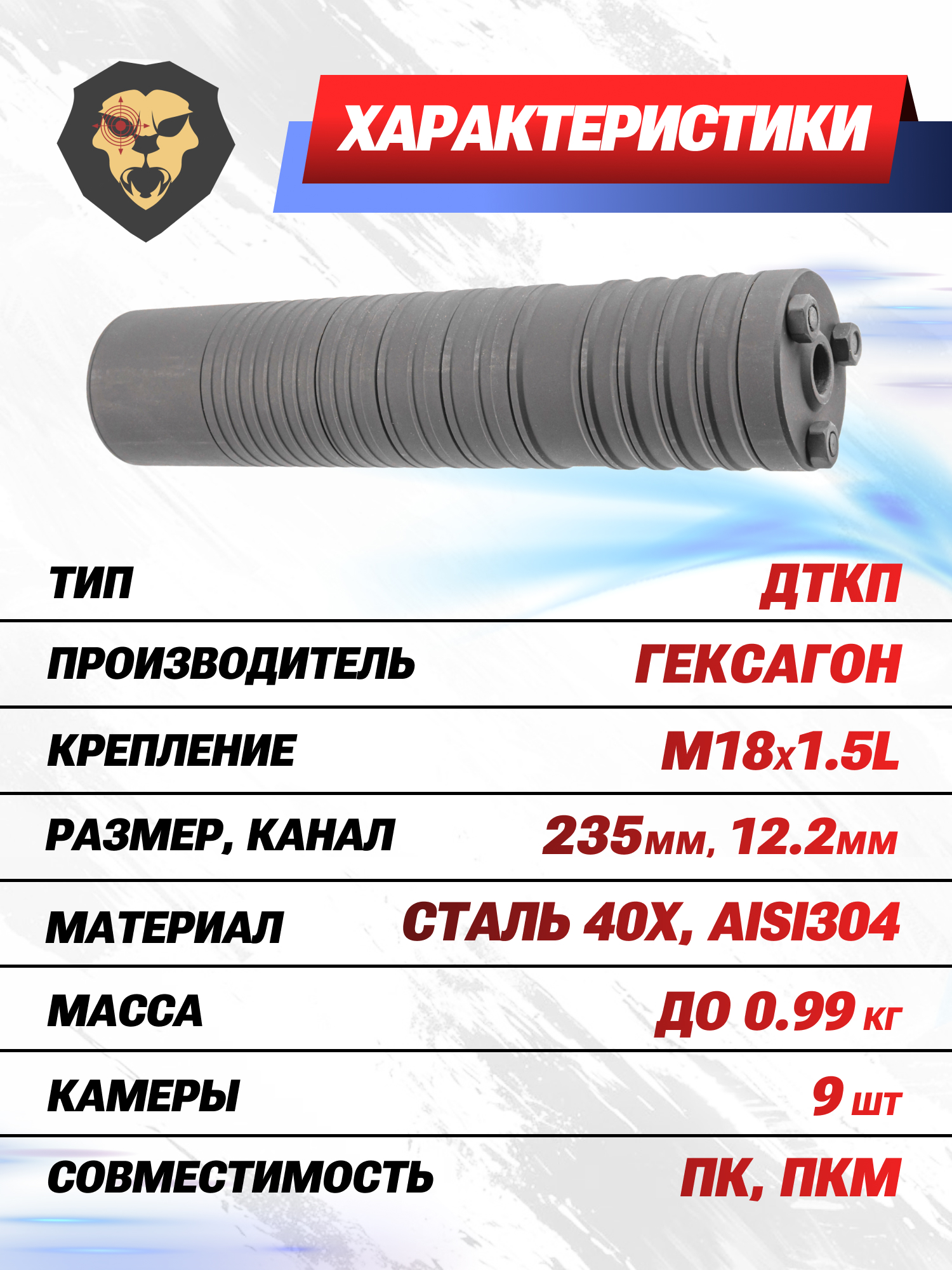 Информация о товаре "ДТКП Гексагон Стандарт для ПКМ (7.62х54R, M18x1.5L, 235 мм, 9 камер, сталь)" носит ознакомительный характер, и не является публичной офертой, определяемой положениями Статьи 437 Гражданского кодекса Российской Федерации, характеристики, внешний вид, цвет и комплектация могут быть изменены производителем без уведомления.