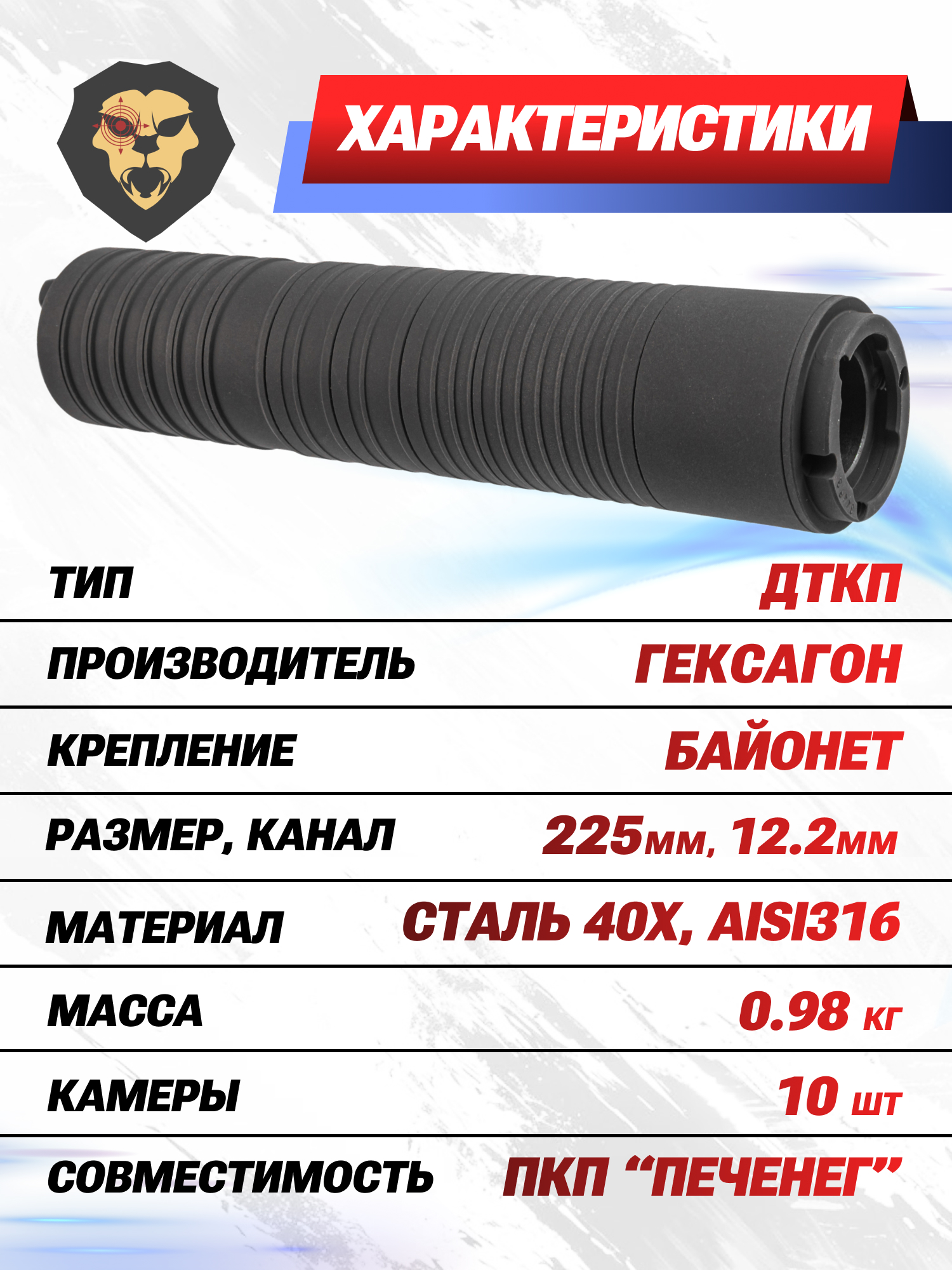 На вооружении российской армии стоят несколько видов общевойсковых пулеметов, к числу которых относится «Печенег». Как и ПКМ, последний рассчитан на использование боеприпасов калибром 7.62x54R и обладает высокой скорострельностью. Из-за этого при выборе дульных приспособлений стоит отдавать предпочтение вариантам, обладающим увеличенным ресурсом и устойчивым к перегреву - эти особенности заявлены в рассматриваемом ДТКП от компании Гексагон.
