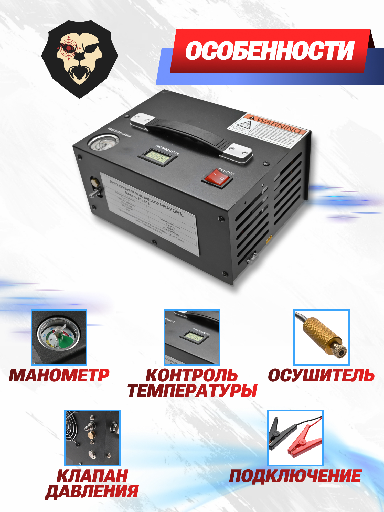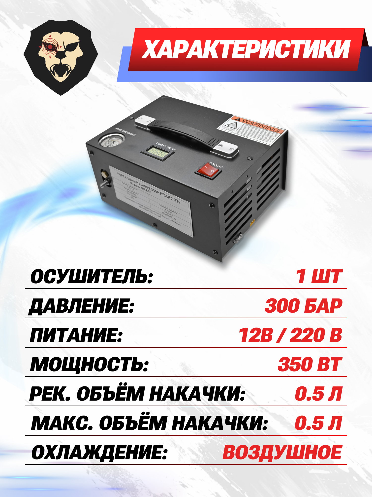 Электрический компрессор Прапоръ за короткий промежуток времени нагнетает воздух до рабочего показателя многих моделей ПСП пневматики в 300 Бар. Вести оперативный контроль текущего давления поможет информативный манометр. Подача воздуха в резервуар винтовки происходит посредством подсоединяемого шланга с фильтром-осушителем и головкой под быстросъемные штуцеры.