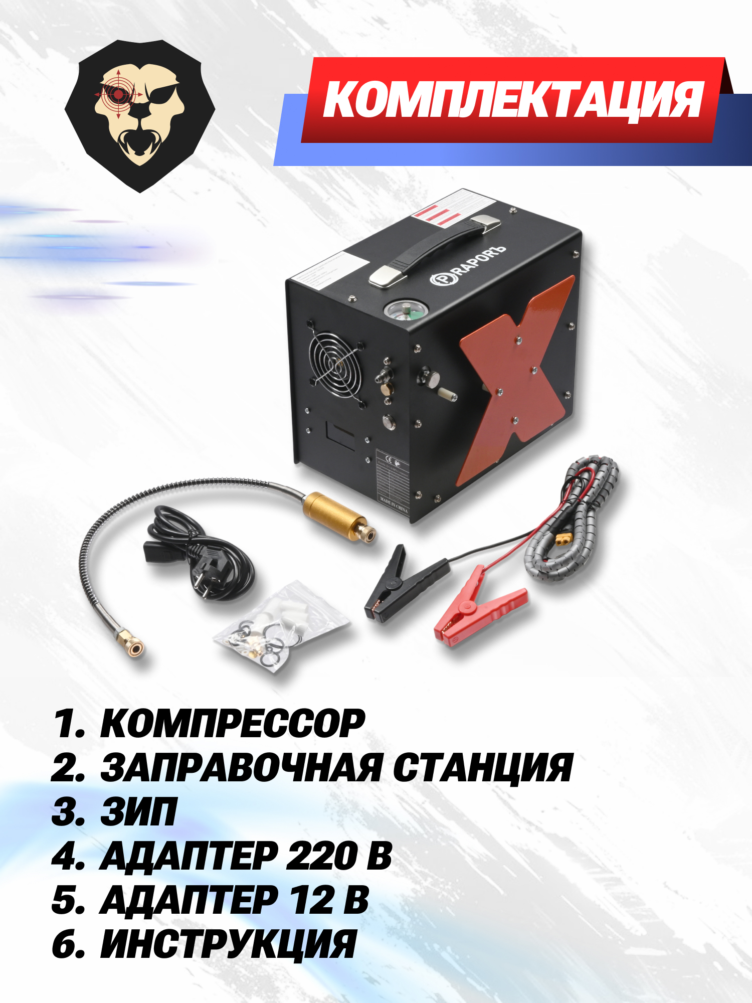 | Комплектация | Компрессор, заправочная станция, ЗИП, адаптер питания 12-220 В, упаковка |