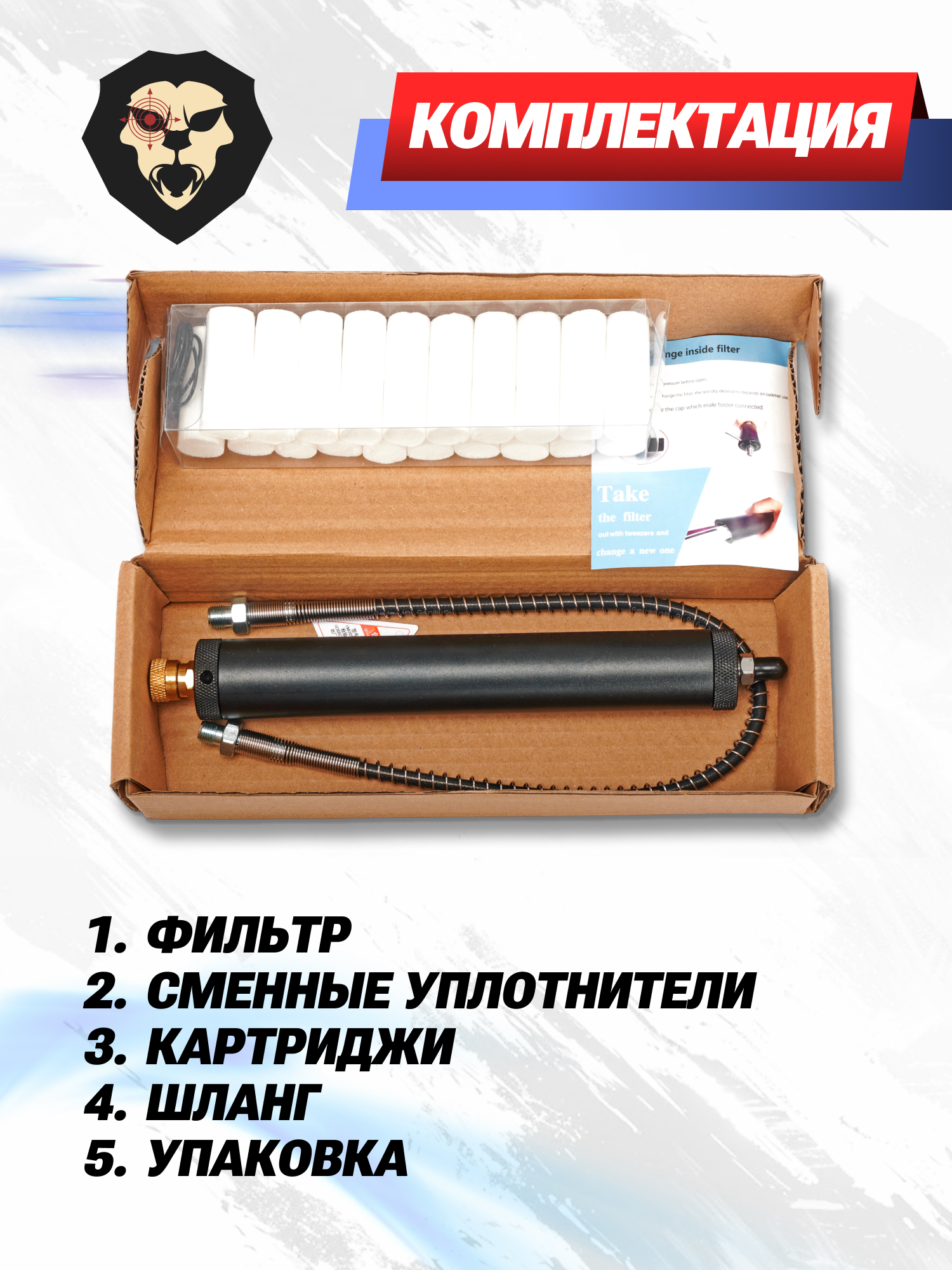 Описываемый фильтр Airmega также используется как осушитель при подключении к компрессорам или насосам, предотвращая попадание влаги во встроенный баллон на оружии. В комплект поставки с рассматриваемым устройством входит набор запасных вкладышей, резиновые уплотнительные кольца, а также армированный шланг.