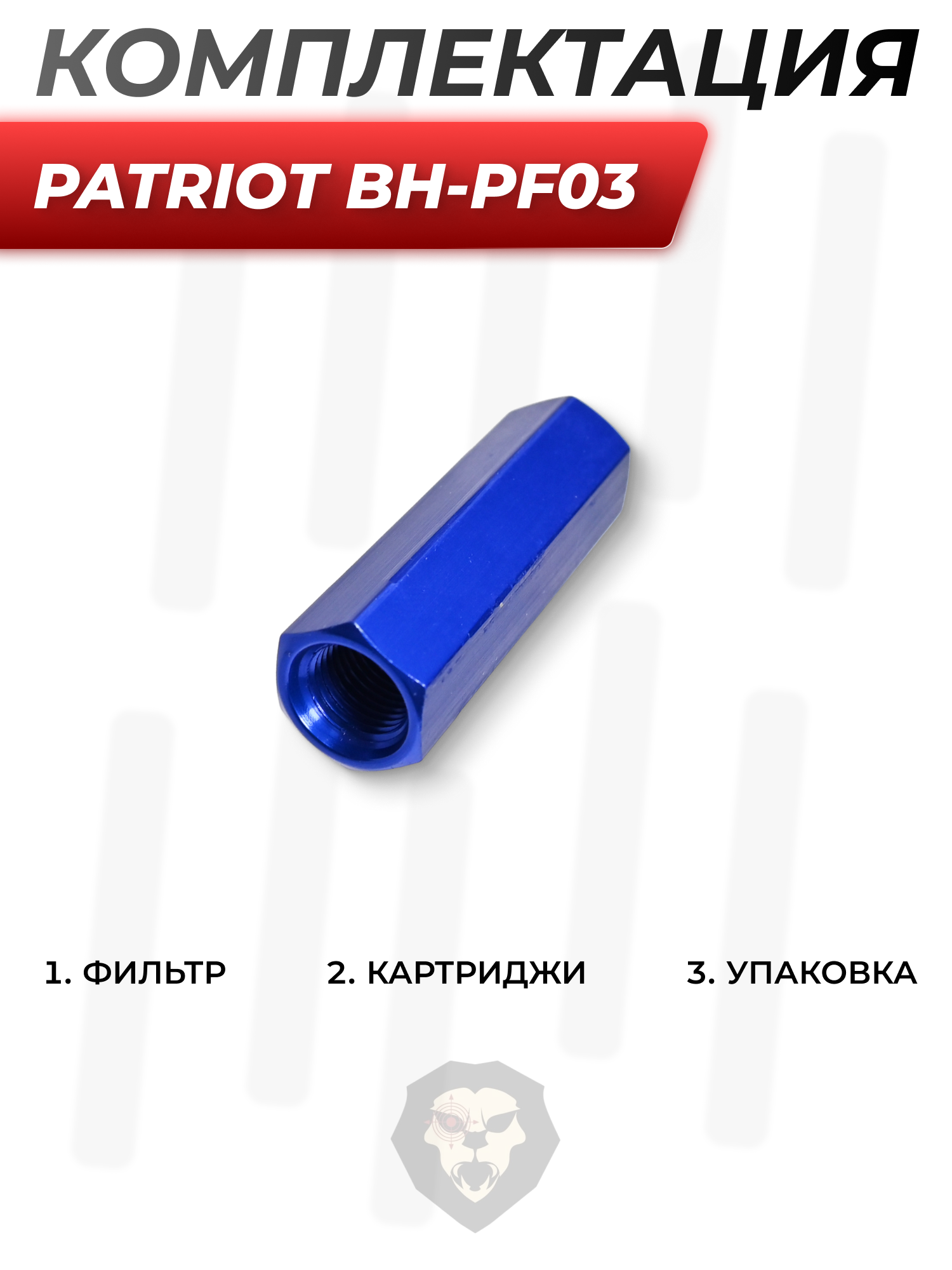 Чтобы защитить механизм ПСП пневматики от попадания частиц пыли и другого абразива в процессе закачки воздуха во встроенный ресивер, насосы фирмы Patriot оснащаются специальными фильтрами. Насадка задерживает мелкофракционную взвесь, не допуская проникновения последней в резервуар винтовки или пистолета. Кроме этого, фильтр вбирает в себя излишнюю влагу из заправляемого воздуха, что позволяет избежать окисления внутренних металлических конструкций пневматики.