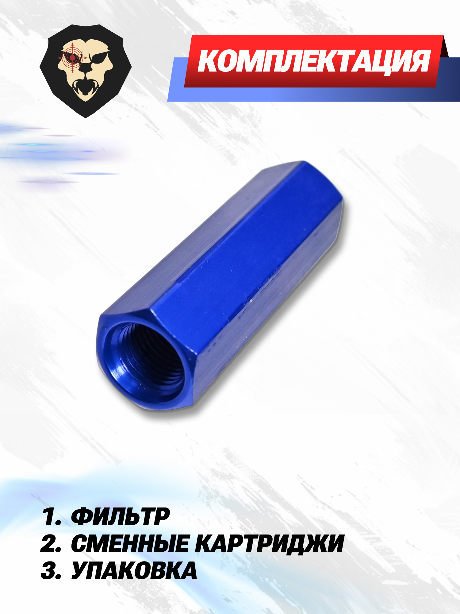 Рассматриваемое изделие фирмы Патриот представляет из себя сквозную шестигранную трубку, которая изготавливается из металла и окрашивается в синий цвет. Покрытие несет не только декоративную функцию, но и дополнительно оберегает поверхность от поражения коррозией. Во внутреннюю полость помещаются небольшие фильтрующие элементы в виде цилиндрических хлопчатобумажных патчей - вкладыши поставляются в комплекте.