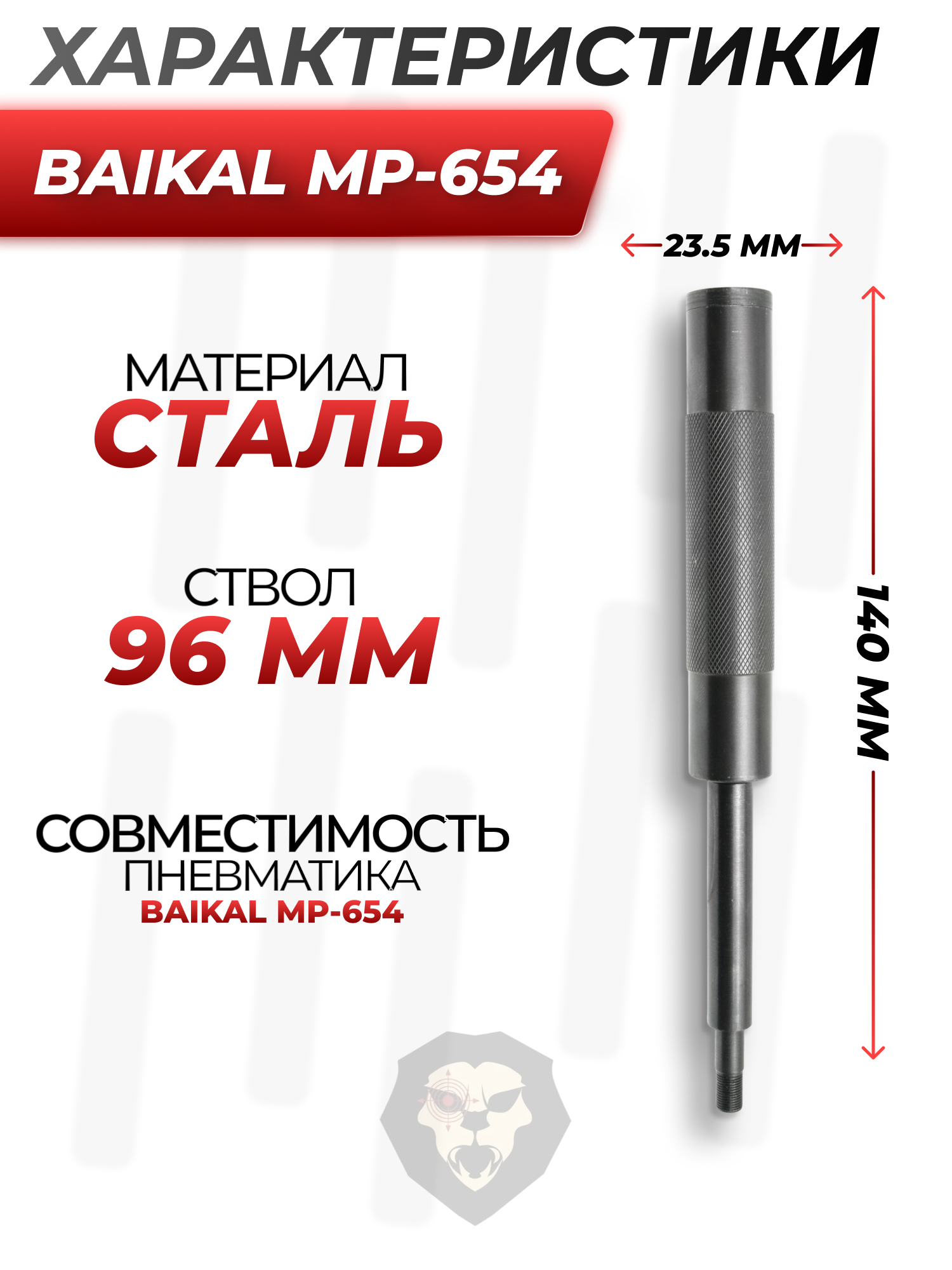 МР 654 ствол от Петр Тюнинг характеризуется длиной 96 миллиметров и устанавливается взамен штатного, в отличие от которого имеет гладкий канал. Диаметр последнего оптимизирован под стрельбу металлическими шариками BB калибра 4.5 мм. Установка выполняется взамен штатного узла путем вкручивания в стандартное посадочное место.
