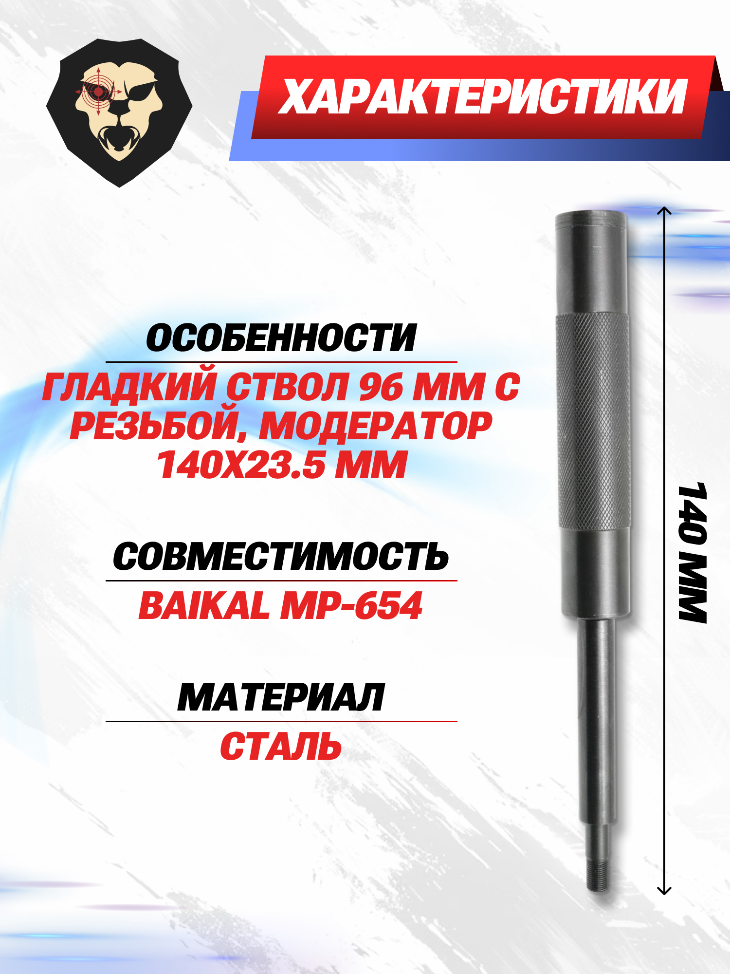 Глушитель выделяется габаритами 140x23.5 мм. Он выступает в качестве удлинителя основного ствола, что повышает кучность боя и благоприятно сказывается на скорости вылета заряда. Все элементы набора вытачиваются из нержавеющей стали и подвергаются обработке защитным покрытием.