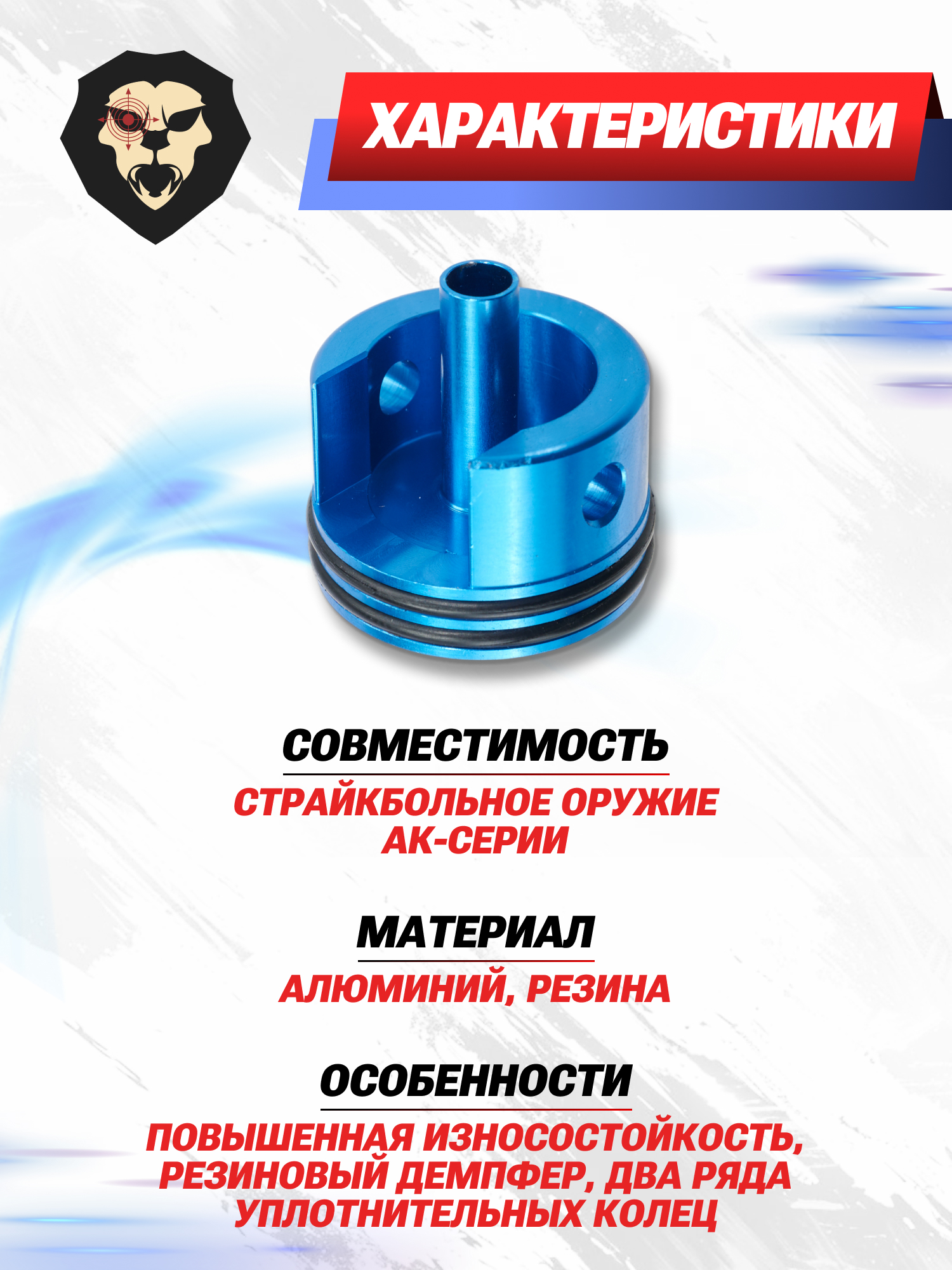 Голова цилиндра изготавливается из металлического сплава алюминия с поверхностной полировкой и применением анодирования. Обозреваемая деталь оснащена эластичным демпфером, который предназначен для гашения ударов при движении поршня вперед, посредством энергии от разжатия пружины. Помимо указанного, основание имеет О-образные кольца из резины для более плотной и гермитичной фиксации.