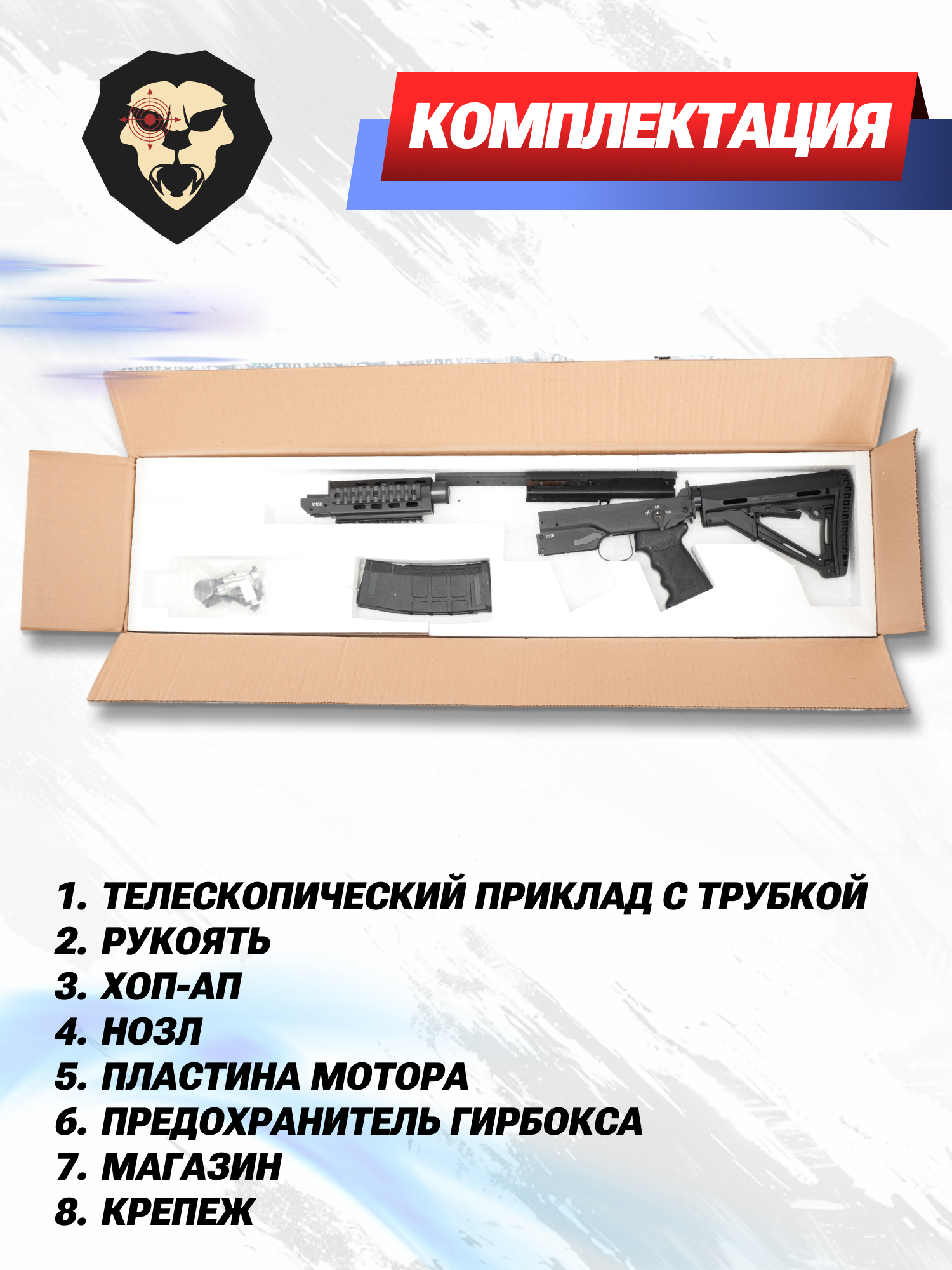 | Комплектация | Боди-кит, телескопический приклад с трубой, пистолетная рукоять, хоп-ап, нозл, пластина мотора, предохранитель гирбокса, магазин, крепеж, упаковка |