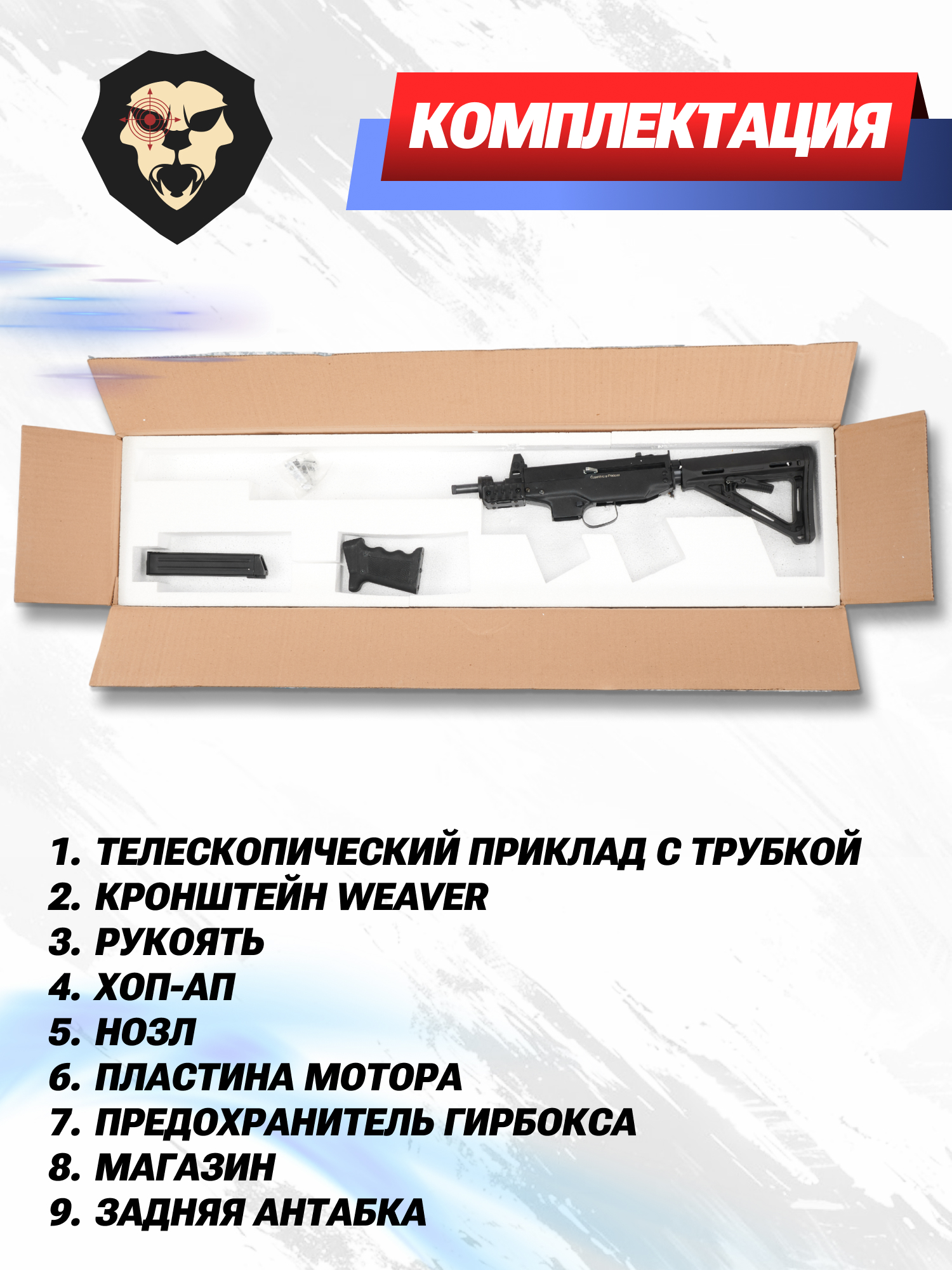 | Комплектация | Боди-кит, телескопический приклад с трубой, кронштейн Weaver, рукоять, хоп-ап, нозл, пластина мотора, предохранитель гирбокса, магазин, задняя антабка, крепеж, упаковка |