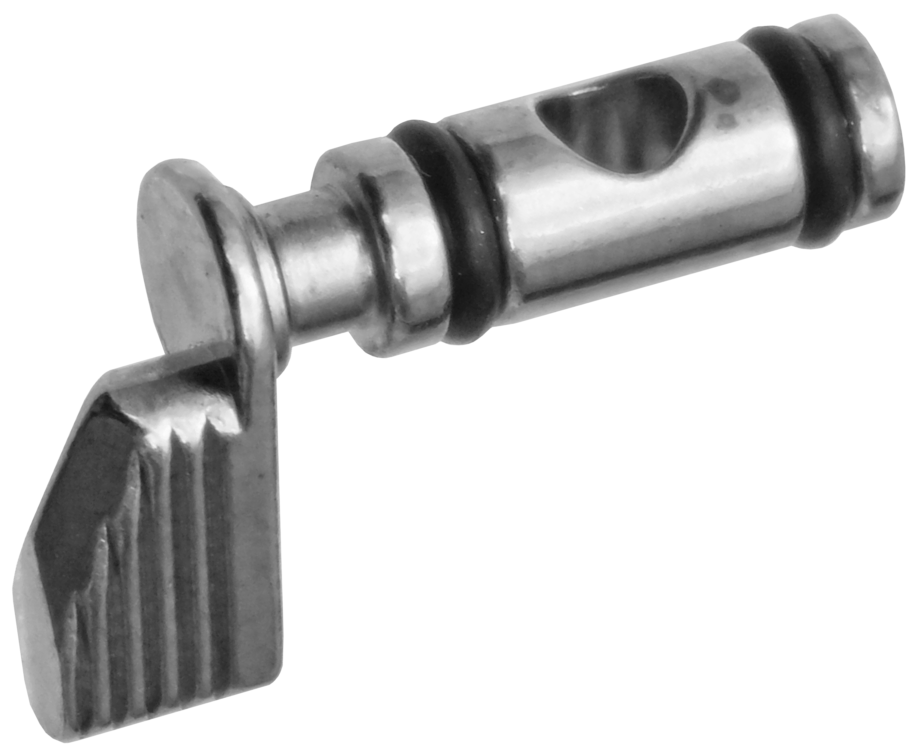 Объем воздуха, пропускаемого из резервуара ВД в ствол, варьируется в зависимости от степени раскрытия клапана. Регулировка происходит вращением втулки вокруг оси - это можно сделать вручную при помощи флажкового рычага. Доступ к нему предоставляется с боковой стороны ствольной коробки пневматики.