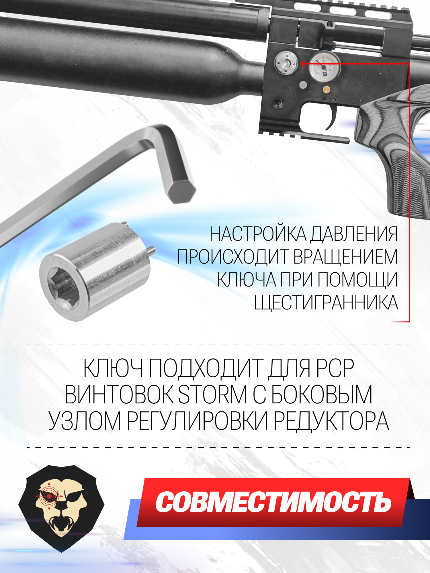 Продуманный механизм схож по действию с таковым у винтовок ЭДган Леший 2 и FX Impact M4 из премиального сегмента. Настройка редуктора производится путем вращения узла - для этого ключ соединяется четырьмя направляющими с гнездом винтовки Шторм Зевс, а непосредственно для поворота можно задействовать шестигранник. Инструмент вытачивается на высокоточном станке из качественного металла, что обеспечивает изделию прочность и долговечность.