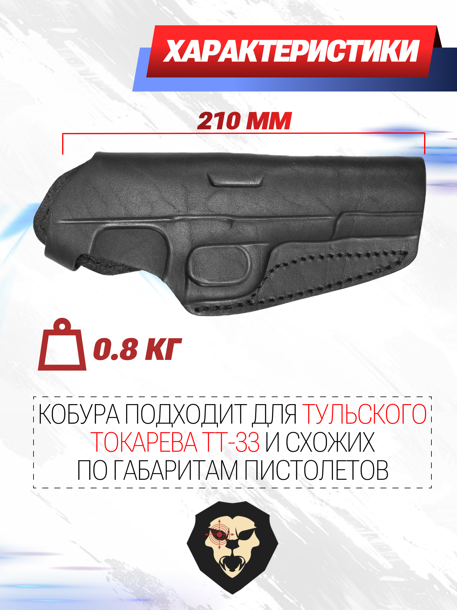 Рассматриваемая кобура для пистолета ТТ изготавливается компанией Хольстер. Модель подойдет как для Тульского Токарева, так под другое оружие, соответствующее габариту 19.5 сантиметров. Основа изделия сделана из кожи и прошита толстым швом.
