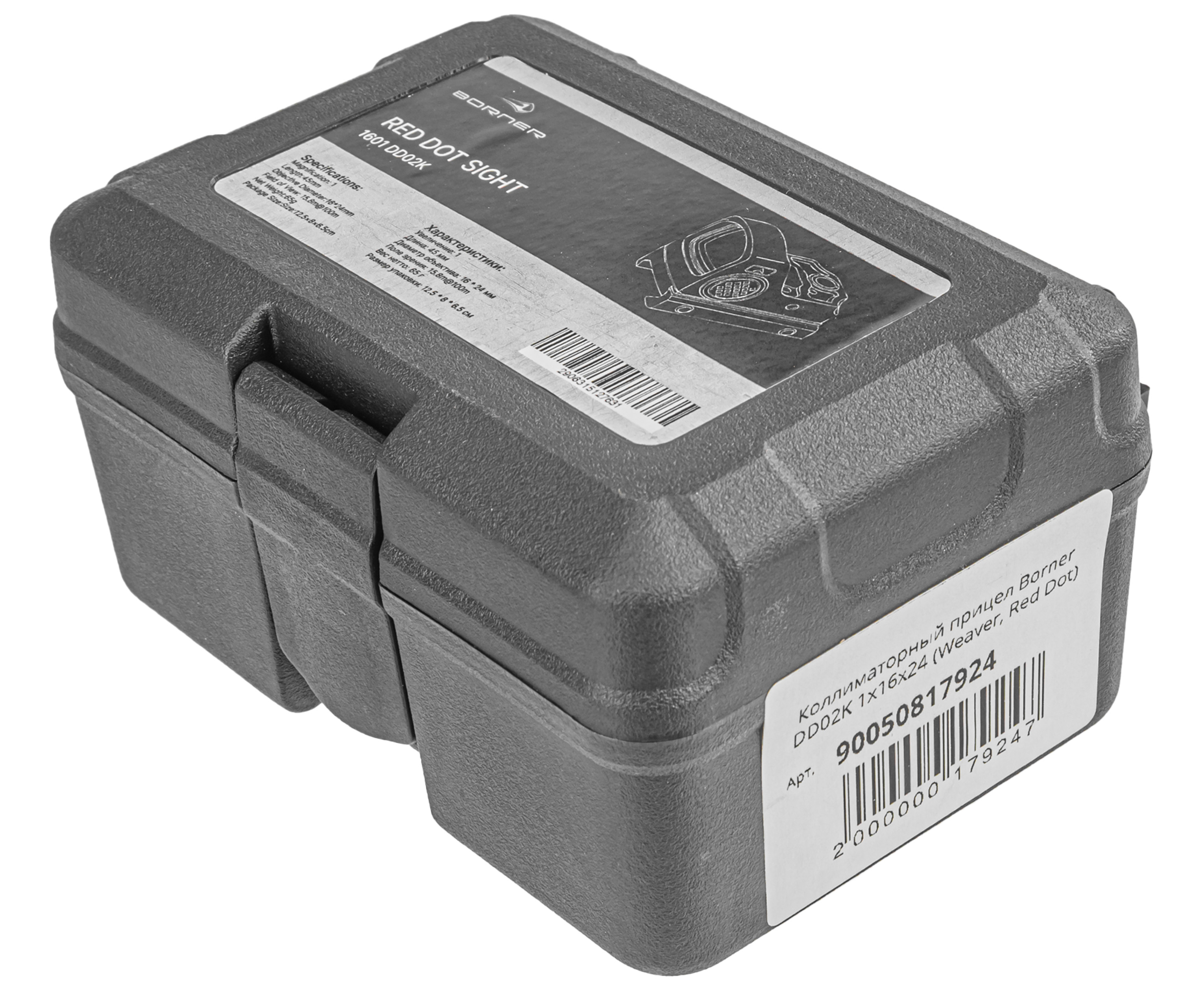 Коллиматор Борнер функционирует от сменной батарейки типа CR2032 и поставляется в полимерном кейсе - набор также включает съемный пластиковый кавер, инструмент и кронштейн для монтажа на оружие. Предполагается установка на направляющую стандарта Weaver 22 мм. Жесткую фиксацию обеспечивают два винта под шестигранник.