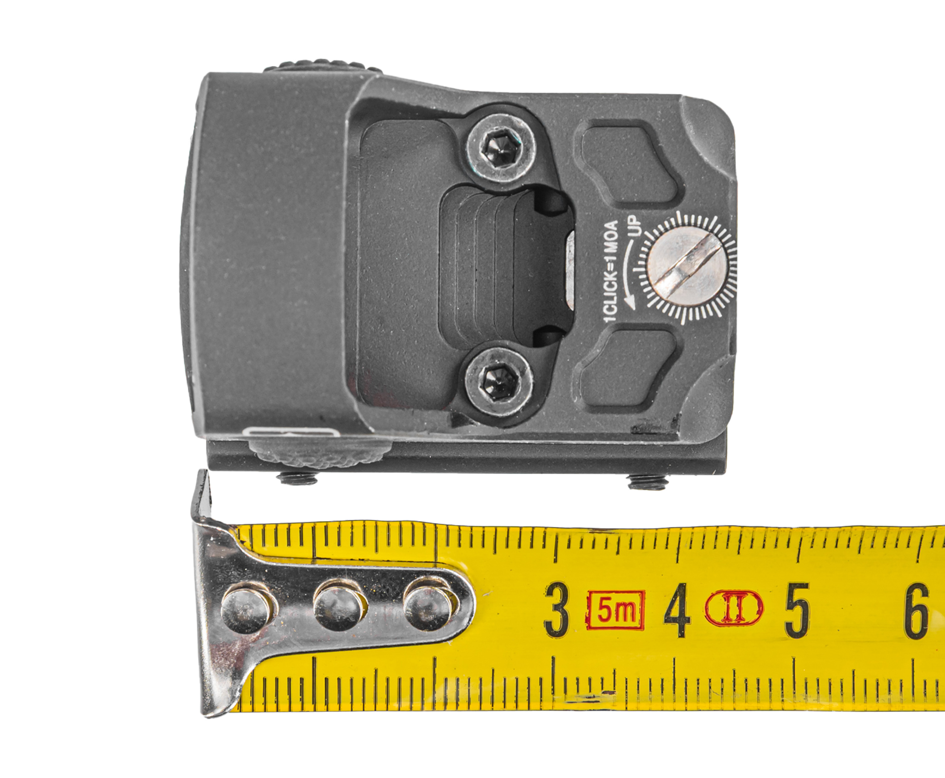 Точка красного цвета отображается с разной яркостью - предпочитаемый режим выставляется нажатием на боковые кнопки, расположенные с двух сторон корпуса. Из органов управления также стоит отметить наличие юстировочных винтов. Путем вращения оных осуществляется выверка прицельной марки по вертикали и горизонтали с шагом в одну угловую минуту.