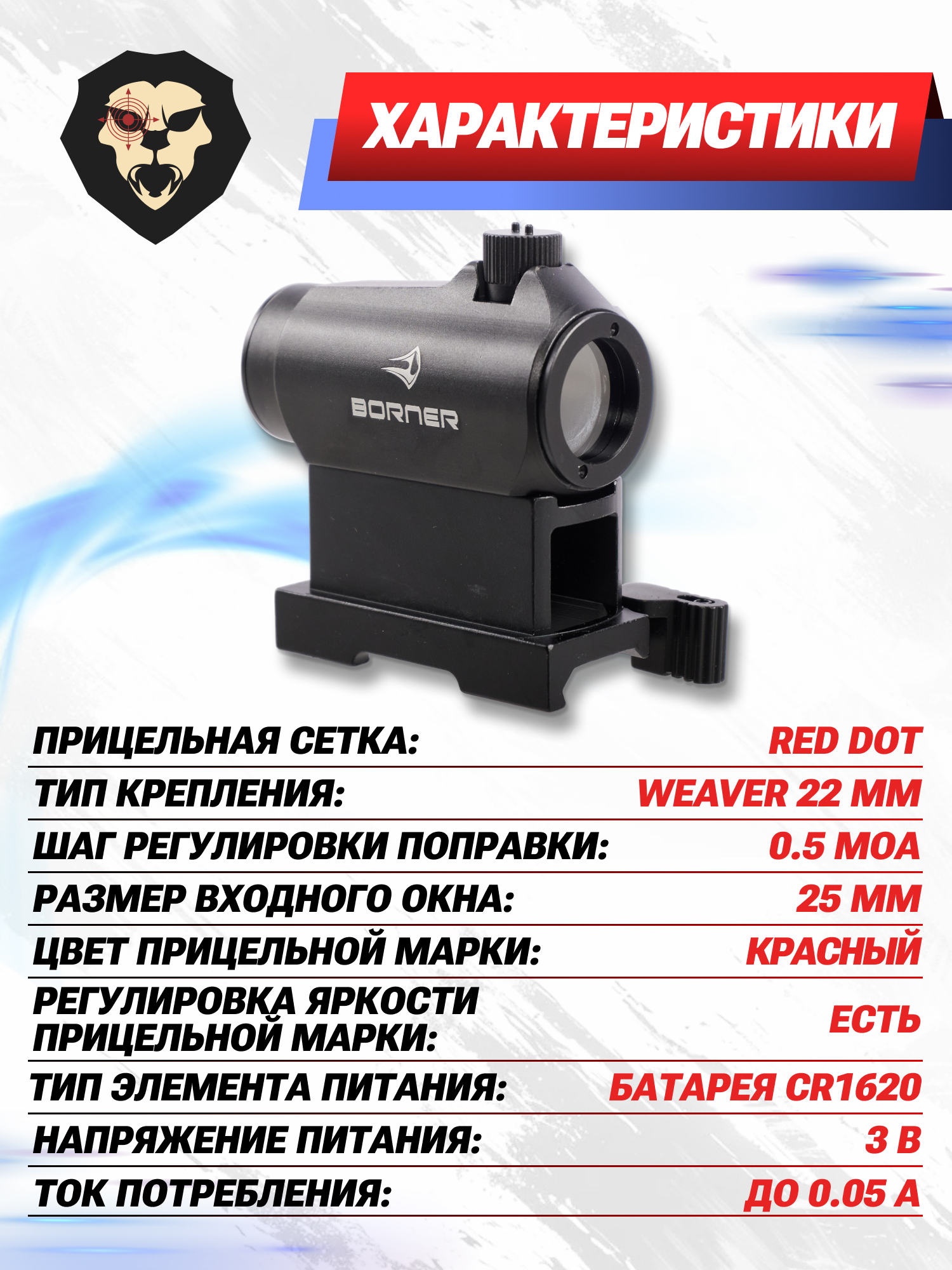 Информация о товаре "Коллиматорный прицел Borner RDB T1 1x25 (Weaver, Red Dot)" носит ознакомительный характер, и не является публичной офертой, определяемой положениями Статьи 437 Гражданского кодекса Российской Федерации, характеристики, внешний вид, цвет и комплектация могут быть изменены производителем без уведомления.