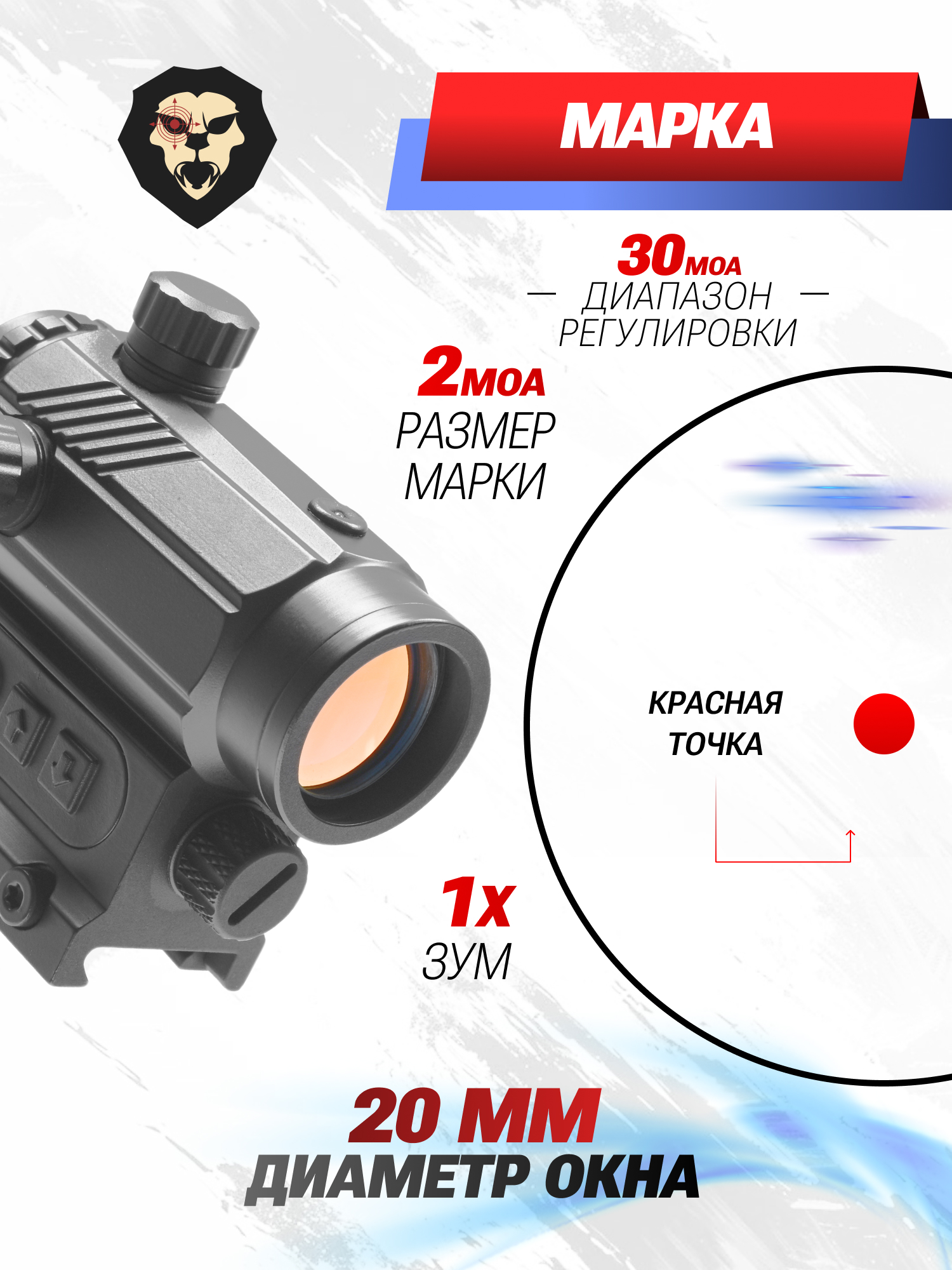 Особенности 11 режимов яркости, диапазон регулировки по вертикали и горизонтали - до 30 MOA, размер точки - 2 MOA