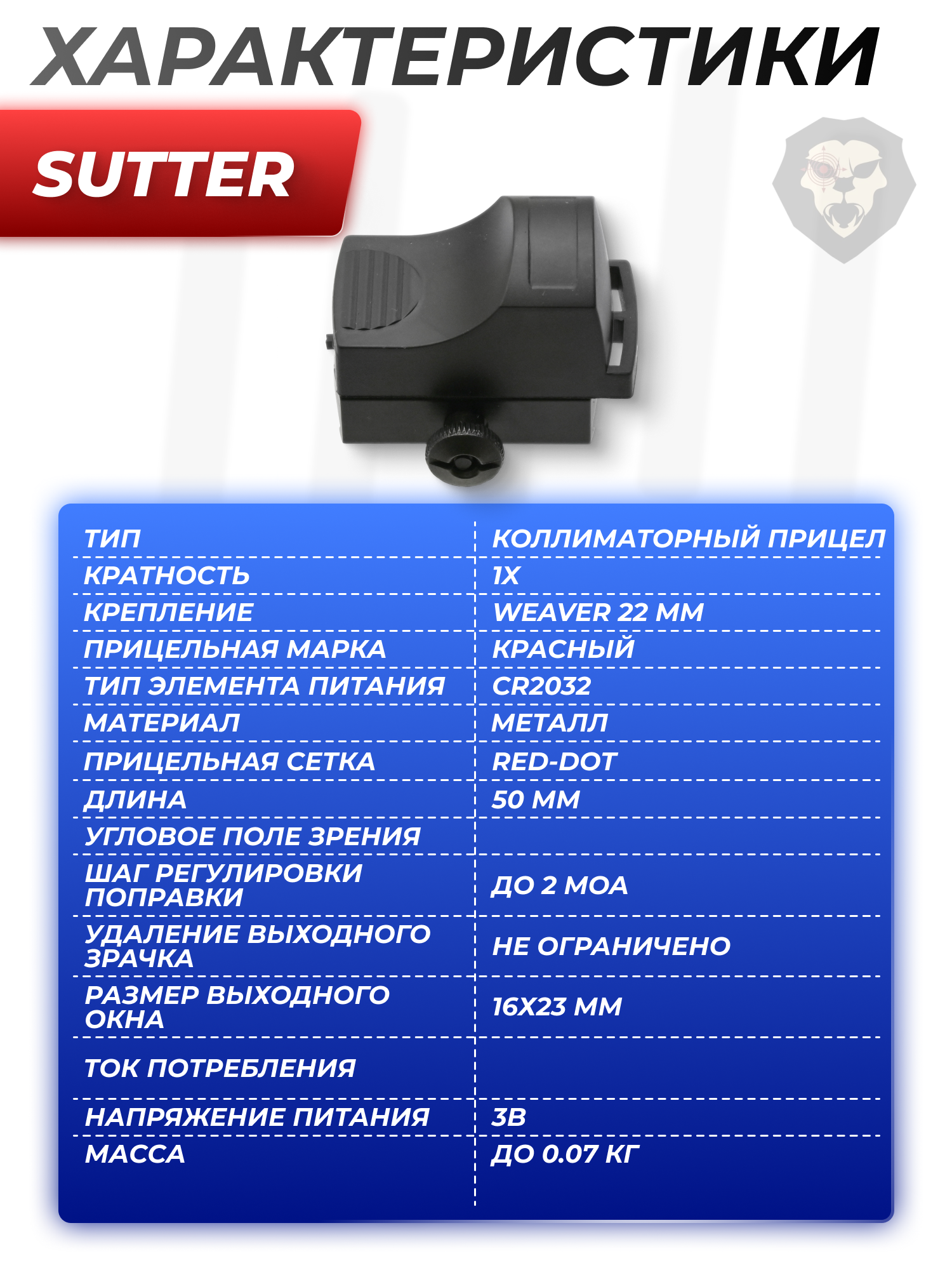 Информация о товаре "Коллиматорный прицел Sutter 1x16x23 (BH-KST01, Weaver)" носит ознакомительный характер, и не является публичной офертой, определяемой положениями Статьи 437 Гражданского кодекса Российской Федерации, характеристики, внешний вид, цвет и комплектация могут быть изменены производителем без уведомления.