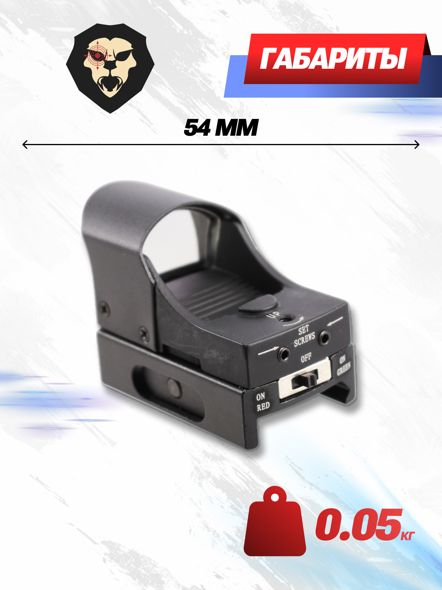 Коллиматор на 12 калибр управляется одним тумблером. Боковые положения рычажка включают один из оттенков марки. Соответственно среднее положение выключит прибор.