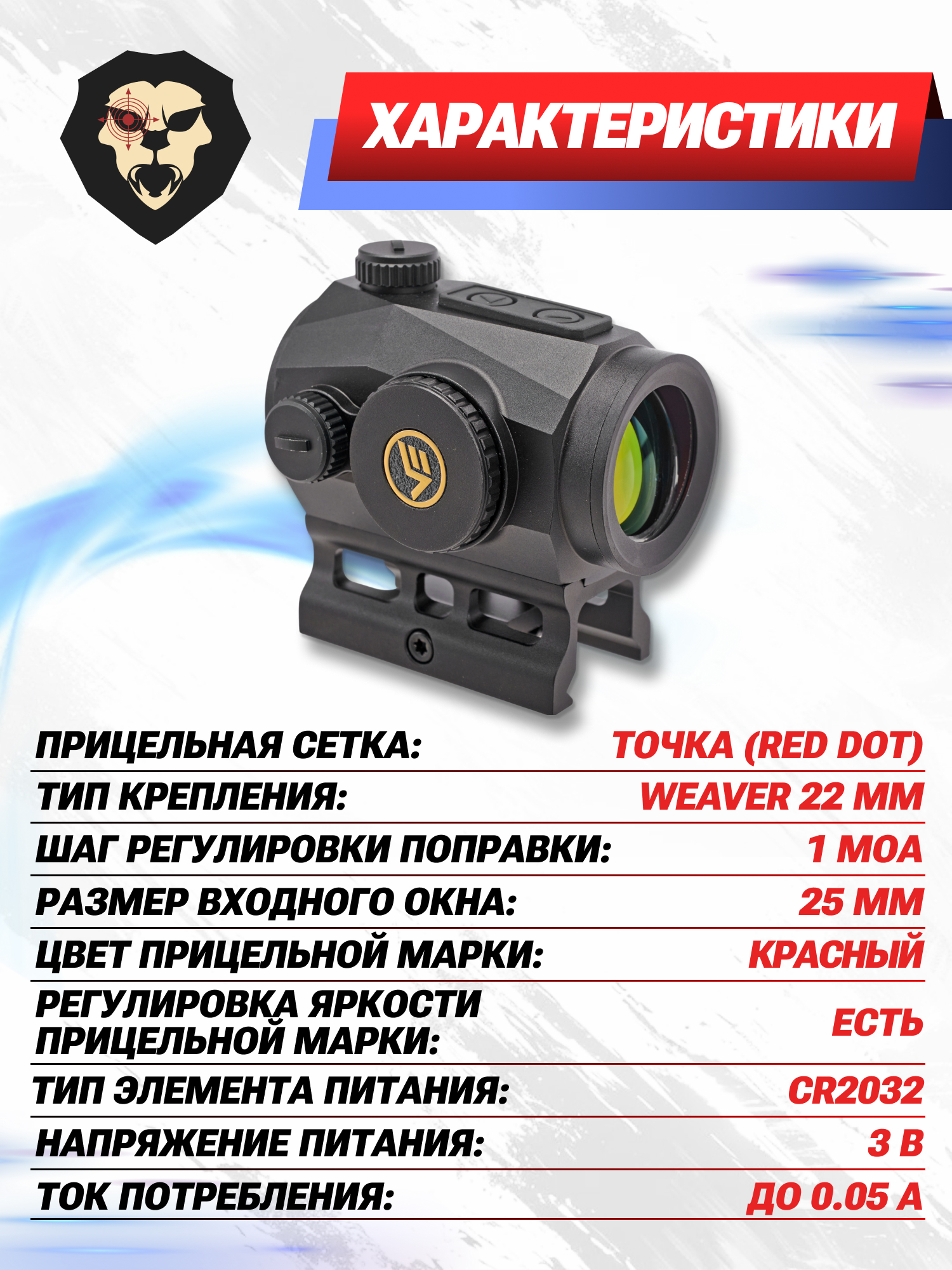 Точное позиционирование метки производится благодаря юстировочным винтам по вертикали и горизонтали, с возможностью изменения положения на 1 MOA за каждый клик с общим диапазоном коррекции до 45 угловых минут. Стоит уделить внимание линзе с многослойным просветляющим покрытием, которое обеспечивает необходимую четкость и контрастность изображения в сумеречное время. Ее диаметр составляет 25 миллиметров, что в сочетании с фиксированным увеличением 1x предоставляют широкий угол обзора.