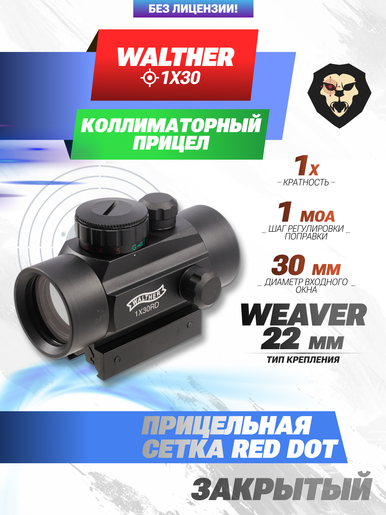Информация о товаре "Коллиматорный прицел Walther 1x30 (BH-KWL03, Weaver)" носит ознакомительный характер, и не является публичной офертой, определяемой положениями Статьи 437 Гражданского кодекса Российской Федерации, характеристики, внешний вид, цвет и комплектация могут быть изменены производителем без уведомления.