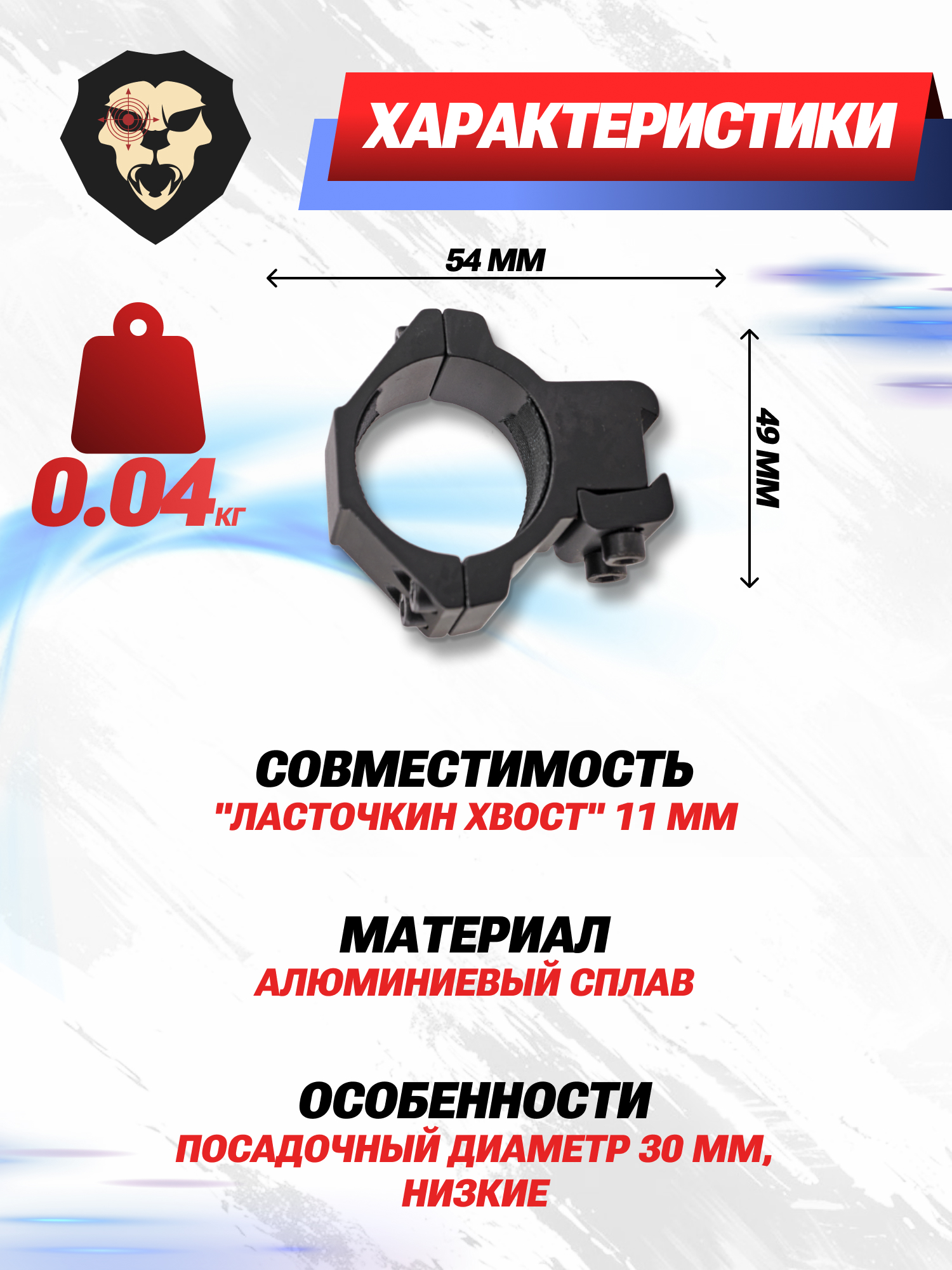 Производятся обозреваемые крепежные детали для установки на рельсовую систему стандарта «Ласточкин хвост» 11 мм и допускают удержание оптических прицелов с диаметром корпуса в 30 миллиметров. Для удобного монтажа верхняя часть колец может демонтироваться, а для надежной фиксации оптики используются по 4 винта на каждом устройстве, которые затягиваются с помощью комплектного шестигранника.
