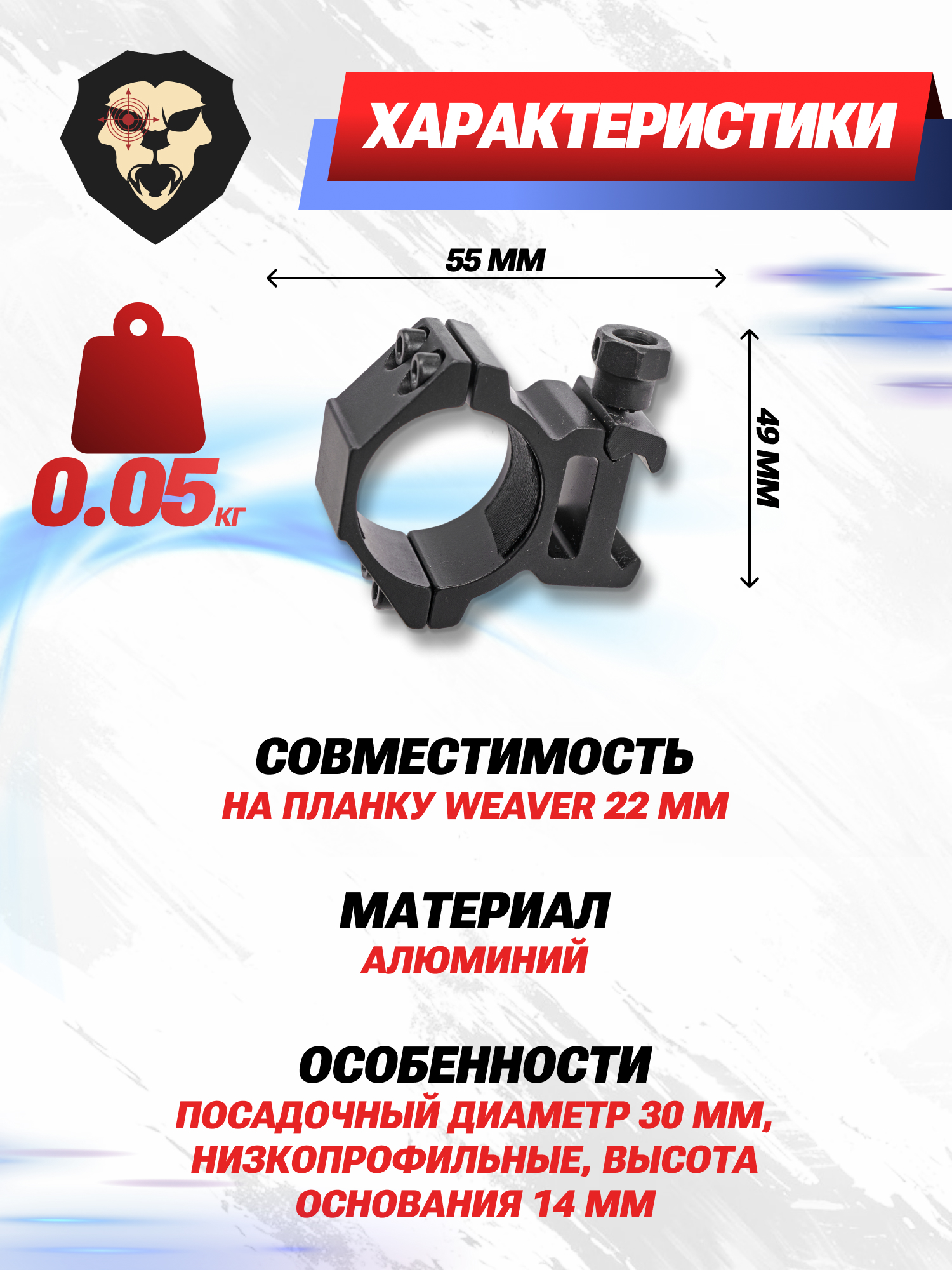 Изделия выполнены из алюминиевого облегченного сплава с противокоррозионным покрытием поверхности. Крепеж представляет из себя двусоставную конструкцию из основания высотой 14 мм и двух полуколец, которые при сочленении надежно удерживают трубку прицела диаметром 30 мм.