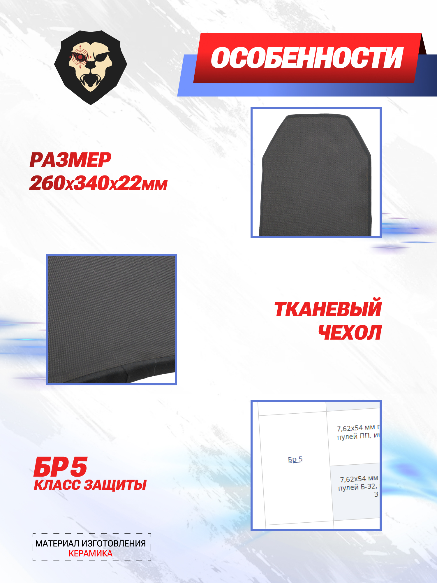 Рассматриваемые элементы в основе конструкции используют керамические пластины из оксида алюминия, укрепленные за счет вставок из высокомолекулярного полиэтилена. Описанный формат исполнения, а также толщина плиты в 22 миллиметра обеспечивают требуемые прочностные характеристики и устойчивость к попаданию пуль распространенных винтовочных калибров 5.45x39 миллиметров, а также 7.62 мм, в том числе боеприпасов бронебойного типа, что относит представленные элементы к классу защиты Бр5.