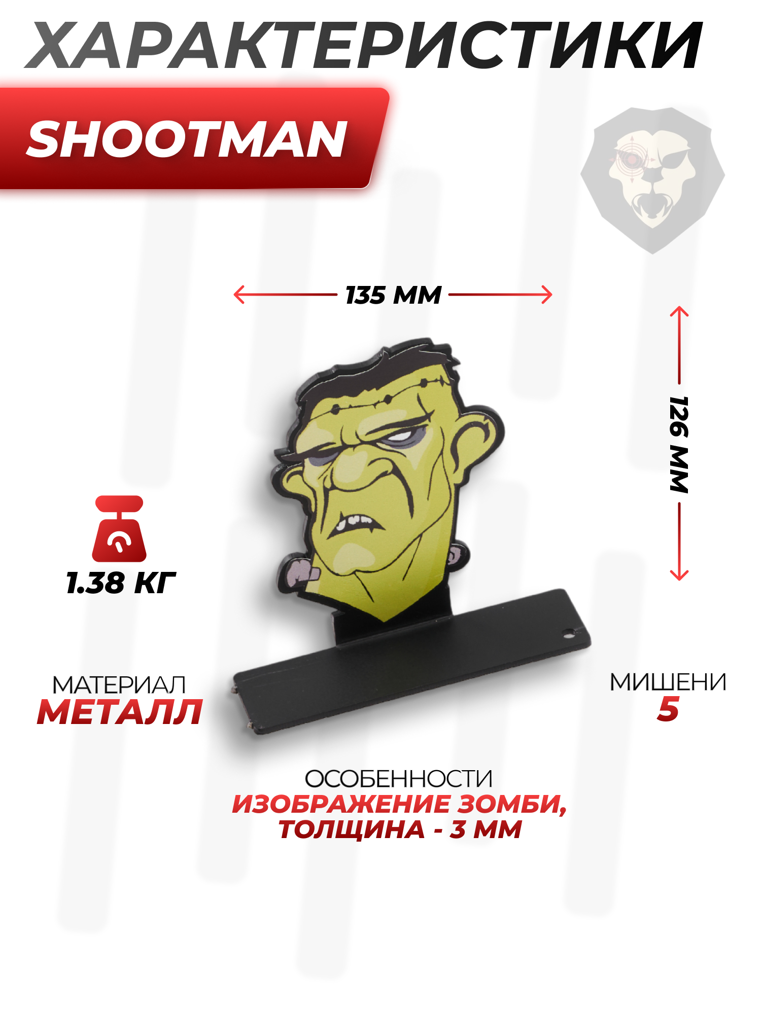 Расширяя товарный ряд, фирма Shootman представила обновленный комплект из 5-и целей, которые изображают популярных монстров - зомби. Антураж изделий подчеркивают высокодетализированные цветные наклейки. Благодаря оным мишени отчетливо видны с расстояния, что упрощает наведение.