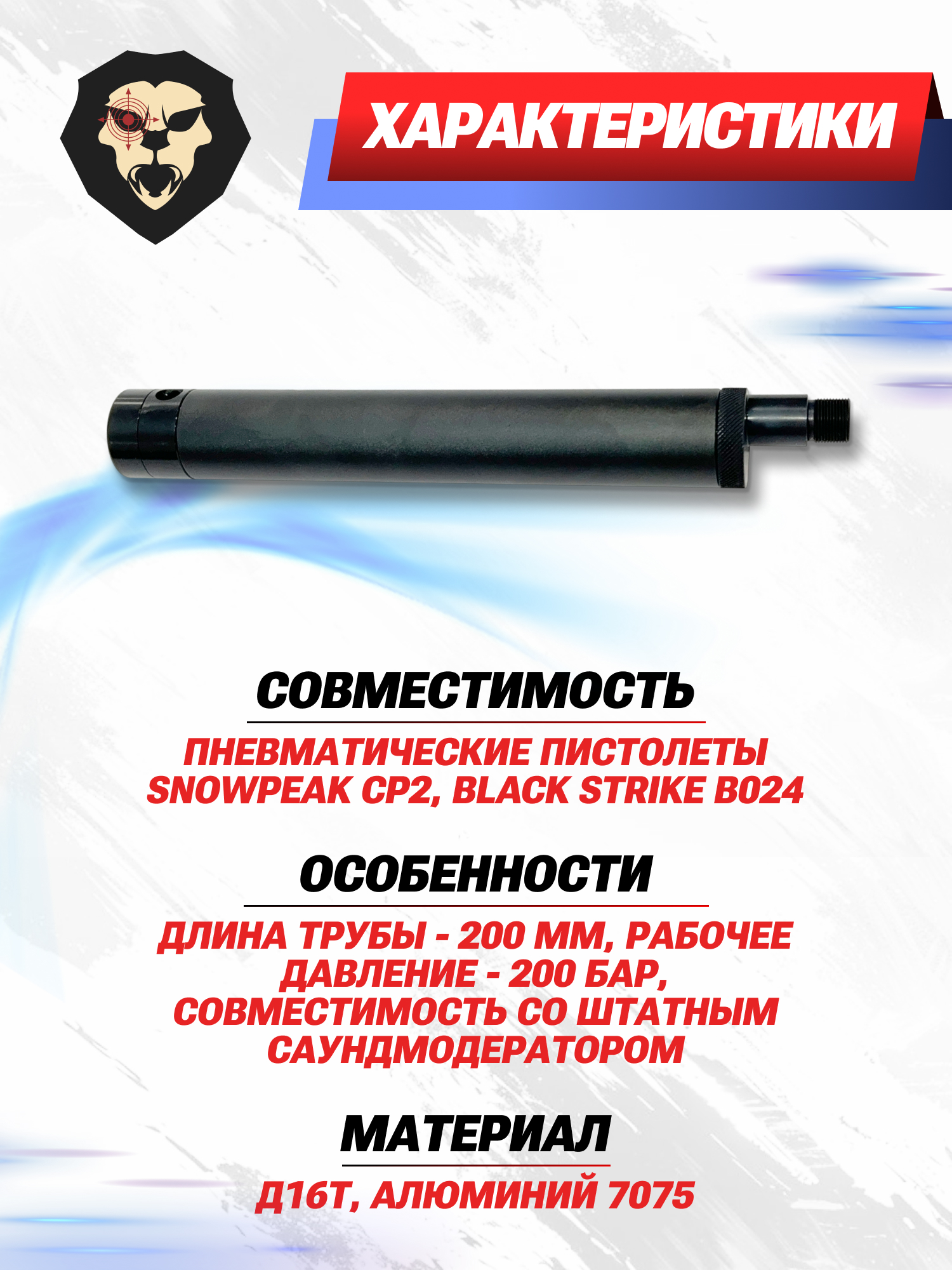 | Особенности | Длина трубы - 200 мм, рабочее давление - 200 Бар, совместимость со штатным саундмодератором |