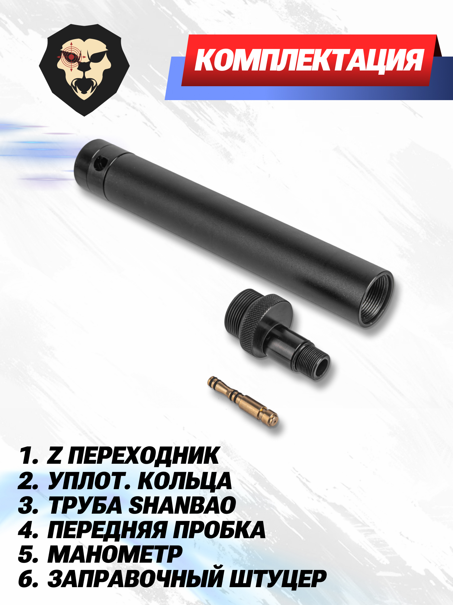 | Комплектация | Z-переходник, уплотнительные кольца, труба ShanBao, передняя пробка, манометр, заправочный штуцер, упаковка |