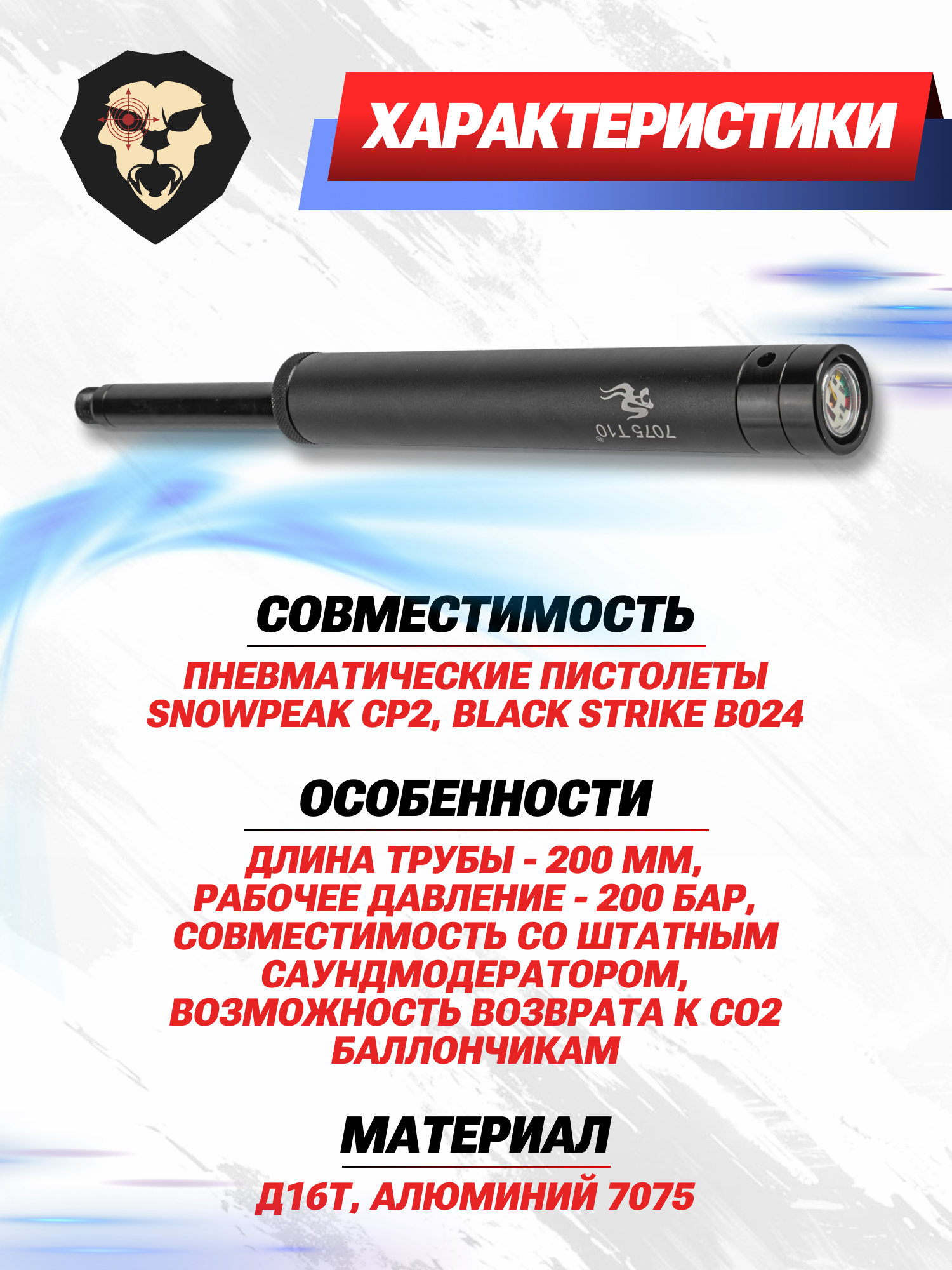 | Особенности | Длина трубы - 200 мм, рабочее давление - 200 Бар, совместимость со штатным саундмодератором, возможность возврата к СО2 баллончикам |