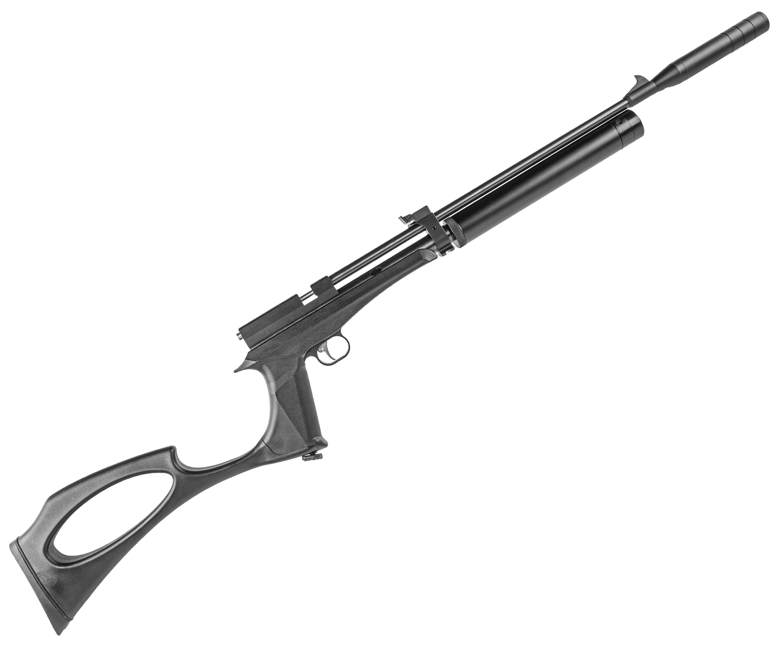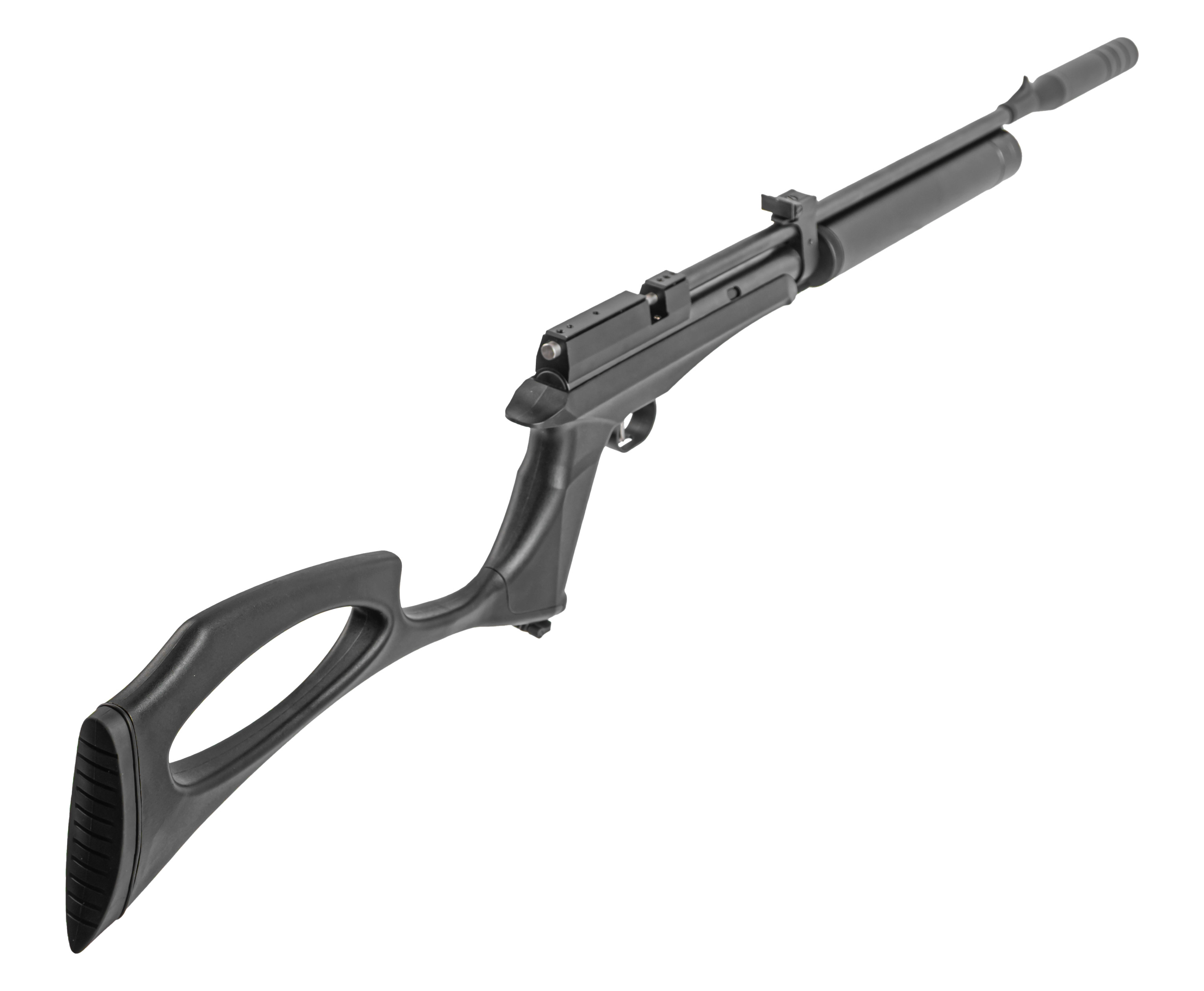 В результате такой модернизации можно получить недорогую PCP винтовку с отстегивающимся прикладом, при этом будет устанавливаться штатный модератор и остается возможность вернуть исходное изделие под работу с СО2 баллончиками.