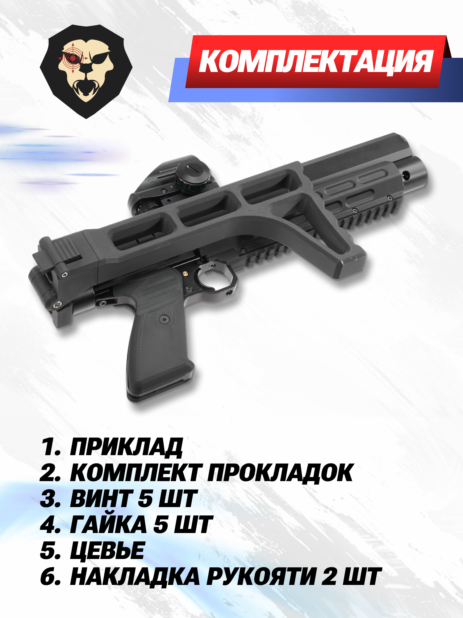 Комплект представленного образца состоит из 3 элементов - цевья, щечек для рукояти и приклада. Конструкция упора складная, переставляемая на обе стороны. Добавление этой детали в оружие снизит сложность прицеливания, вместе с тем сделав попадания результативнее - при этом длина пистолета изменится не критично, т.е. сохранится комфорт транспортировки.