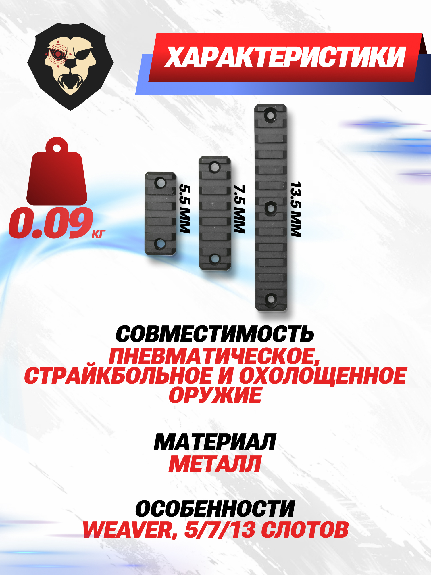 В наборе предусмотрены 3 планки Вивера длиной 13.5, 7.5 и 5 миллиметров. Разнообразие моделей позволяет выбрать подходящую платформу для разных элементов оружия. Соответственно изделия добавляют 5, 7 или 13 слотов под крепление навесов.