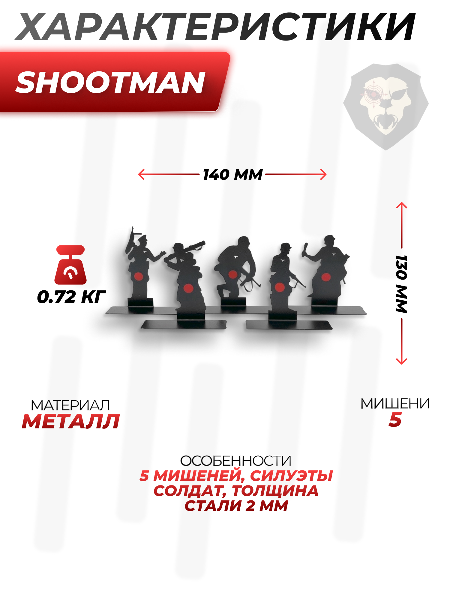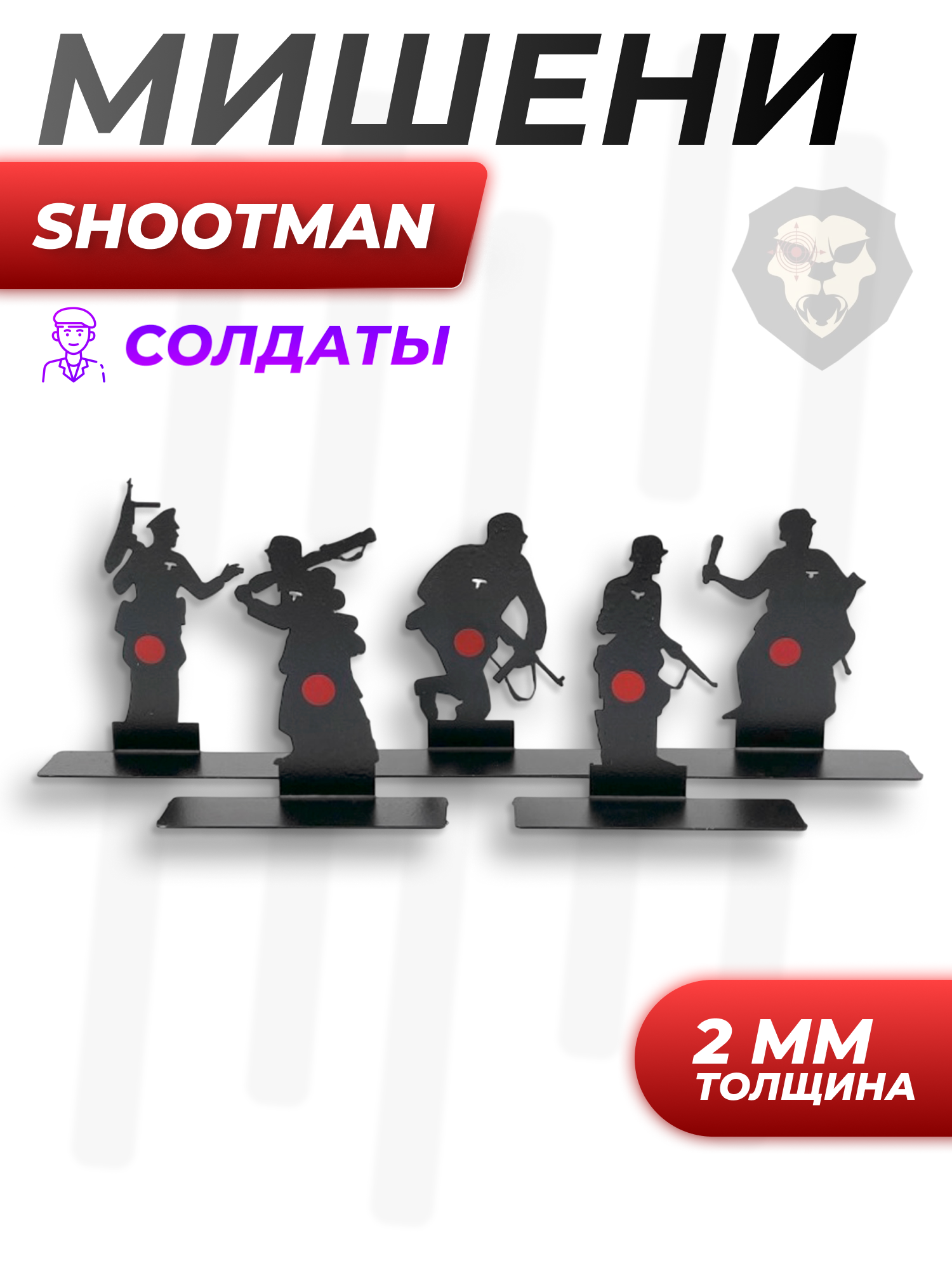 Комплект мишеней Shootman выпускается российской одноименной компанией, специализирующейся на изготовлении оборудования для тиров. В набор входит 5 силуэтов солдат черного цвета с красной точной по центру, которые при попадании падают на землю, после чего их необходимо поднять для продолжения стрельбы. Нанесенная краска характеризуется специальным составом, стойким к повреждениям, ввиду чего повышается долговечность покрытия.