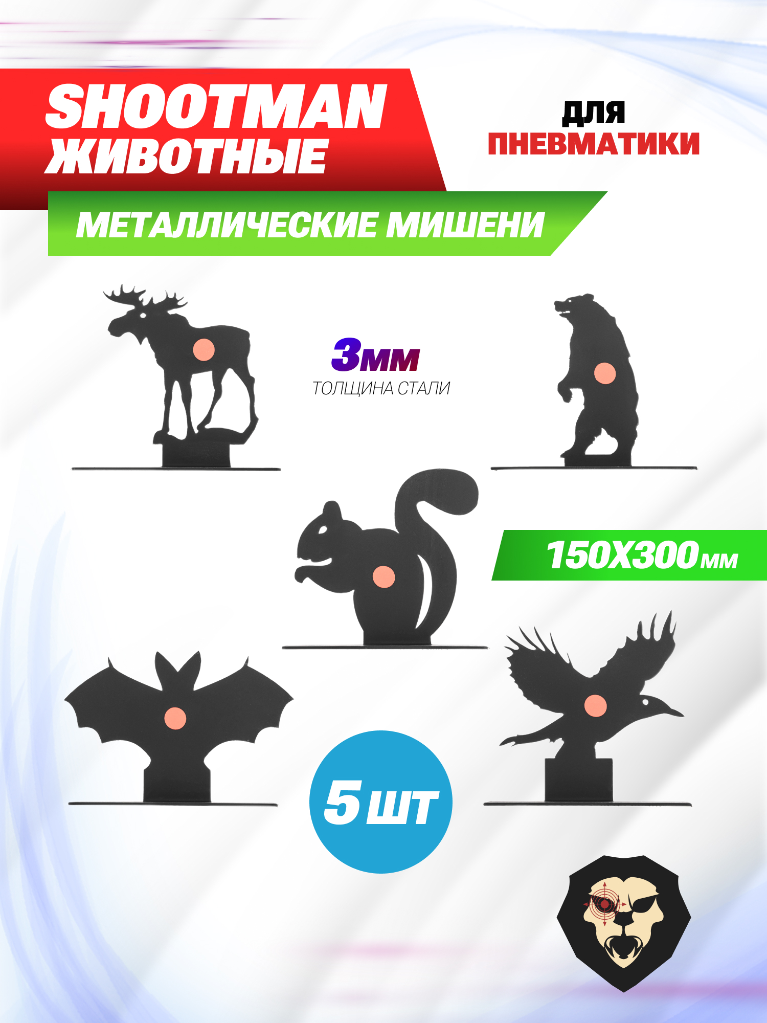 Дополняя модельный ряд металлических целей и гонгов, компания Shootman выпустила комплект мишеней, изображающих различных диких зверей. Силуэты изготавливаются из утолщенного листа 3 мм стали и окрашиваются специальным порошковым составом, выдерживающим многократное попадание снарядов из 3 Дж пневматических винтовок и пистолетов.