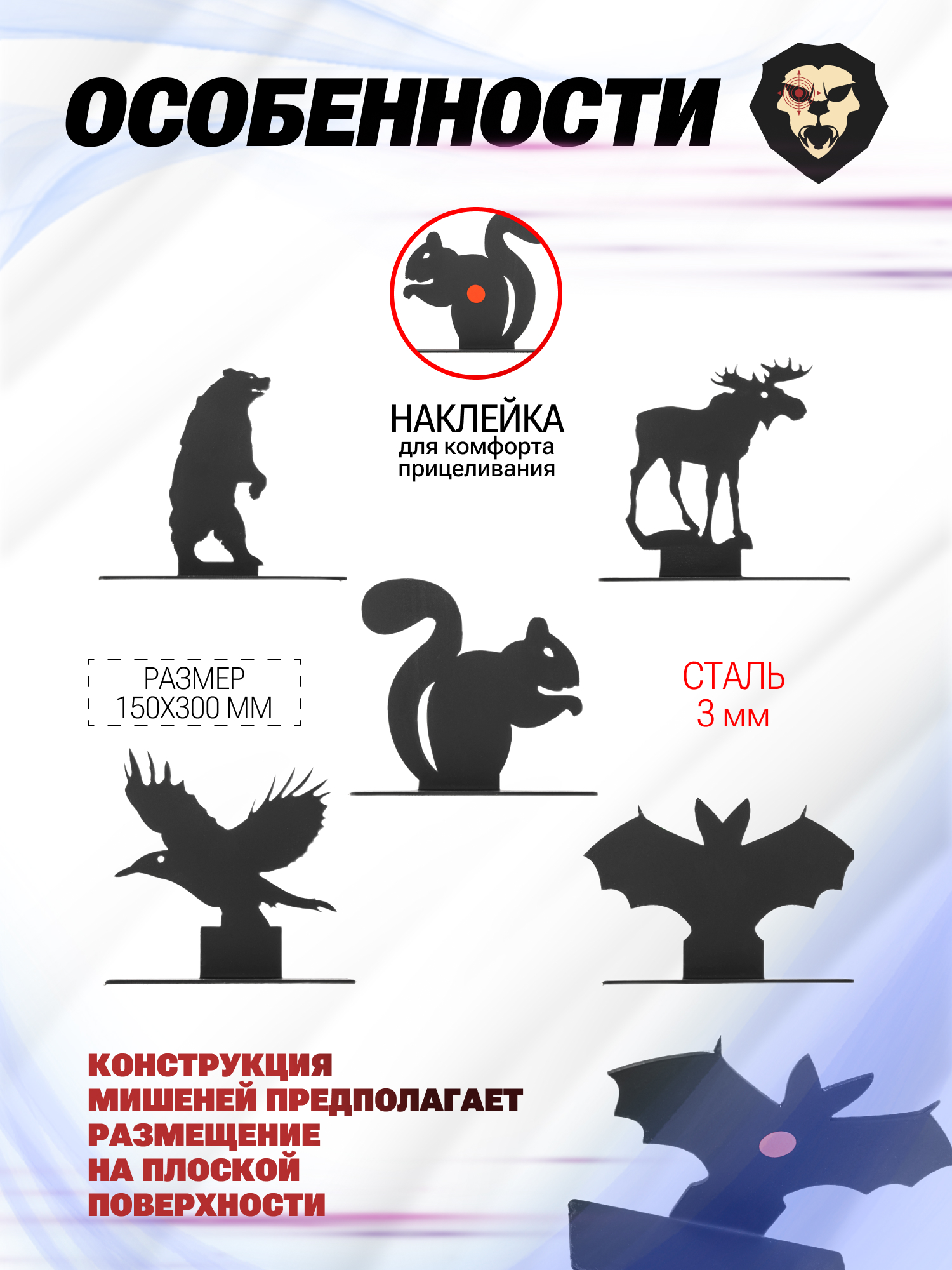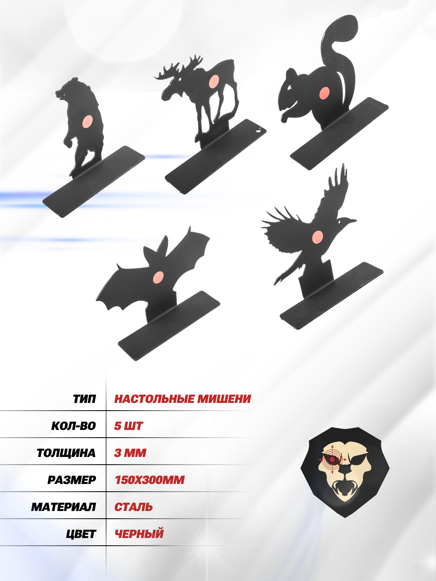 | Особенности | 5 мишеней, силуэты животных, толщина стали 3 мм, размер 150x130 мм |