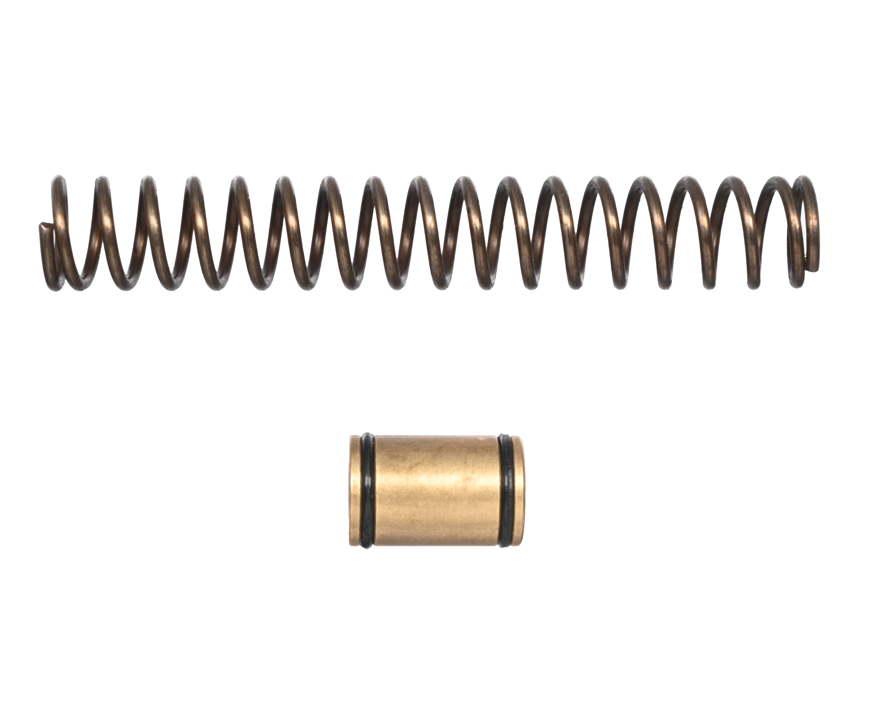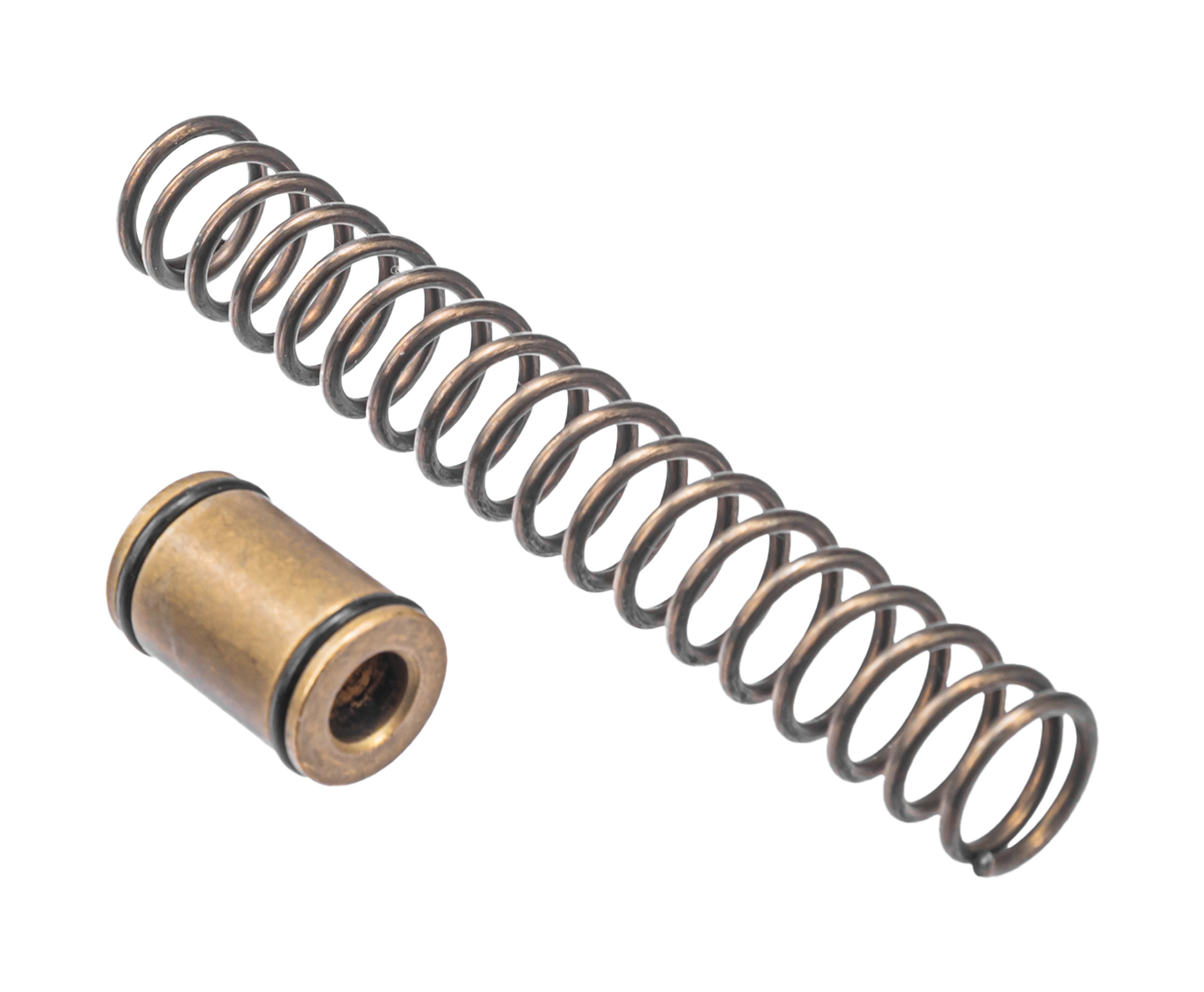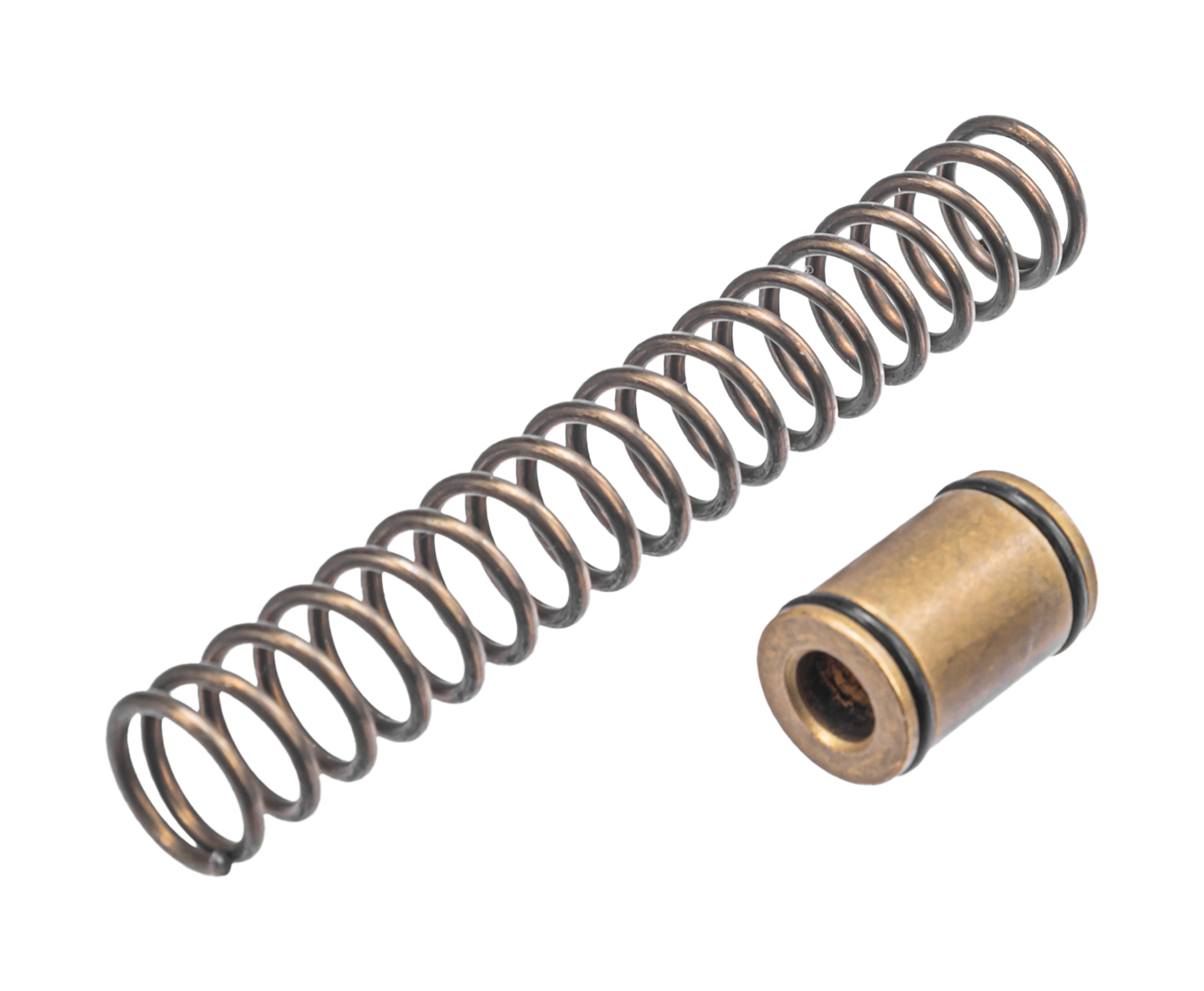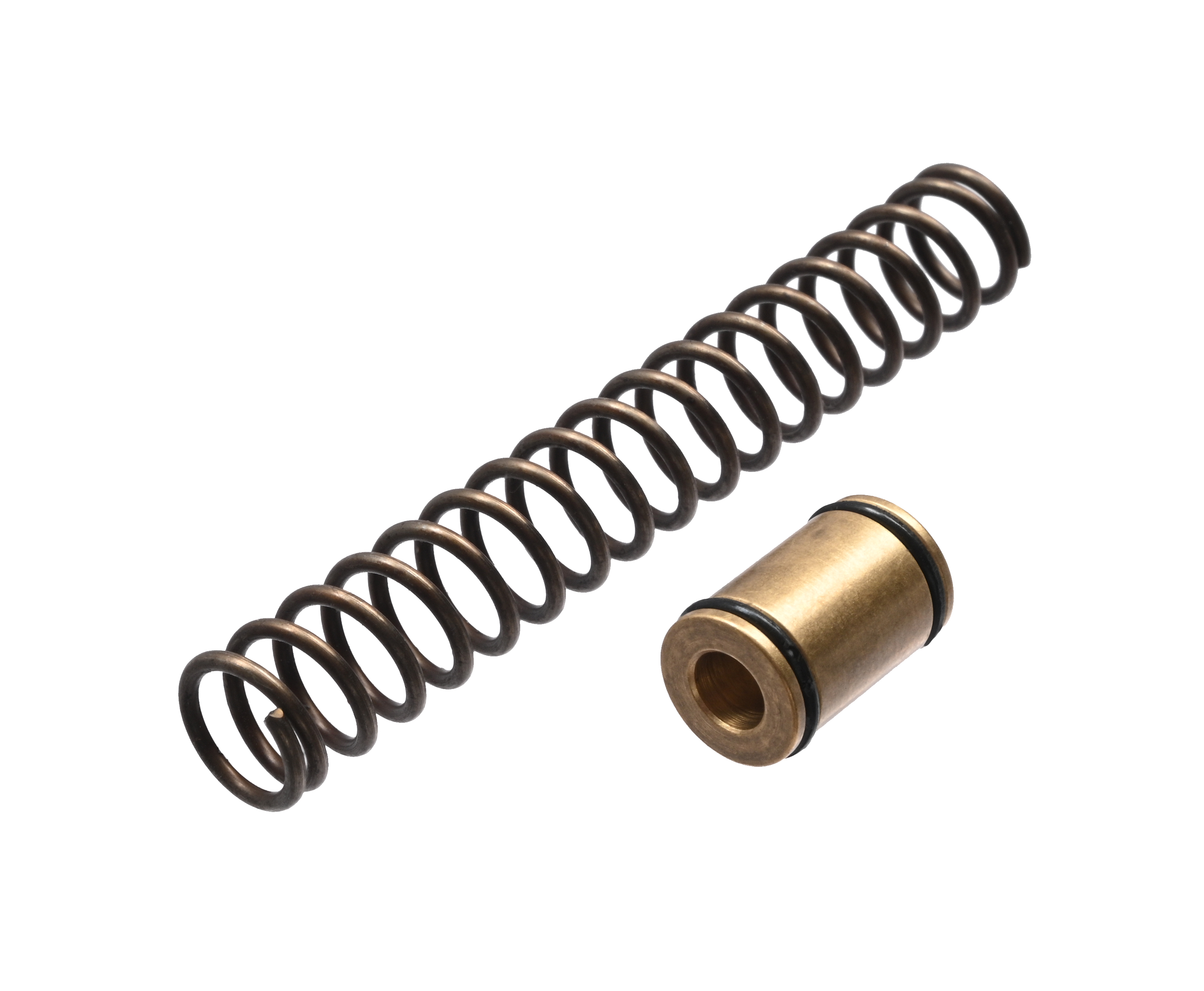 Латунная втулка перепуска характеризуется внешним диаметром 10 миллиметров при проходном отверстии 4.2 мм. Она встает на штатное посадочное место без доработок и служит для точной дозировки объема воздуха, необходимого для выстрела пулей указанного калибра. Для раскрытия клапана и подачи газа в канал ствола также требуется выставить корректное усилие, что осуществляет комплектная пружина - деталь сформирована из закаленного стального прута толщиной 1.2 мм.