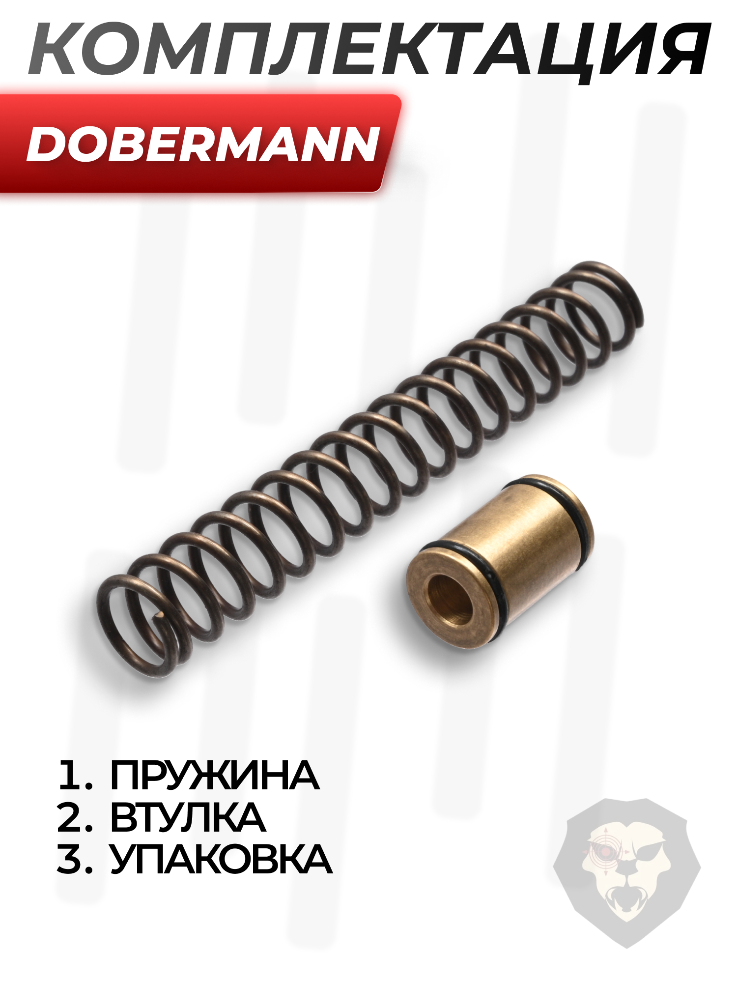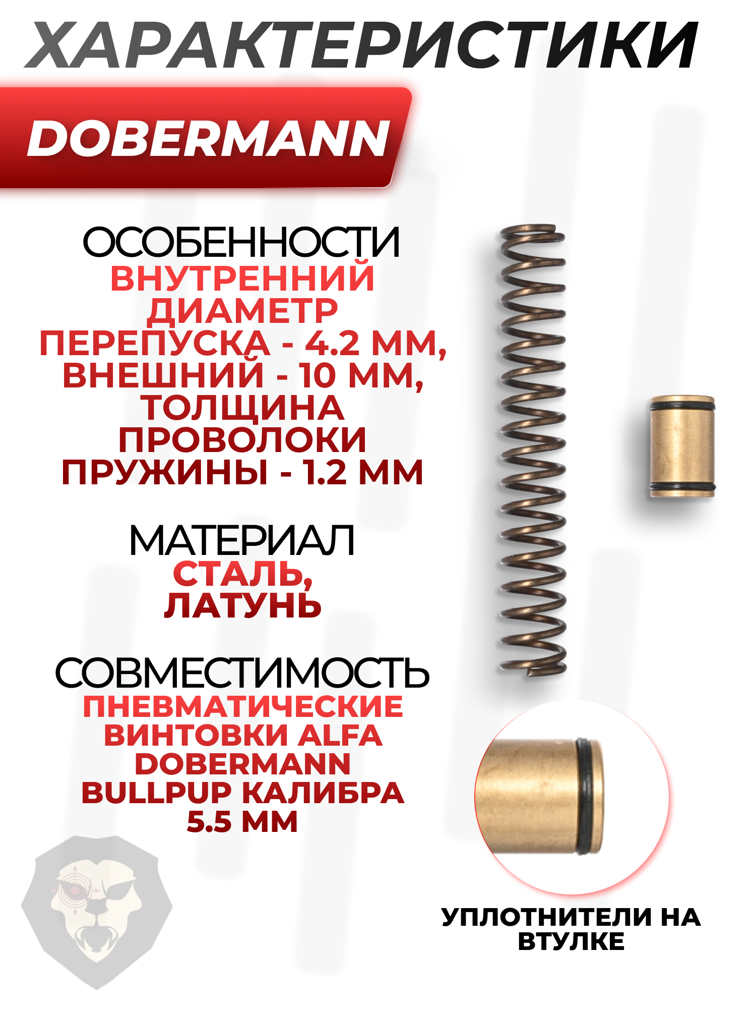 Одним из важных параметров, допускающих персональную настройку пользователем, является пропускная способность боевого клапана. Для достижения повторяемости выстрела и создания условий для предсказуемого функционирования БуллПап пневматики ПСП Альфа Доберман предназначается обозреваемый комплект, состоящий из специальной втулки и пружины. Набор дает произвести тонкую настройку системы под стрельбу воланчиковыми боеприпасами 5.5 мм.
