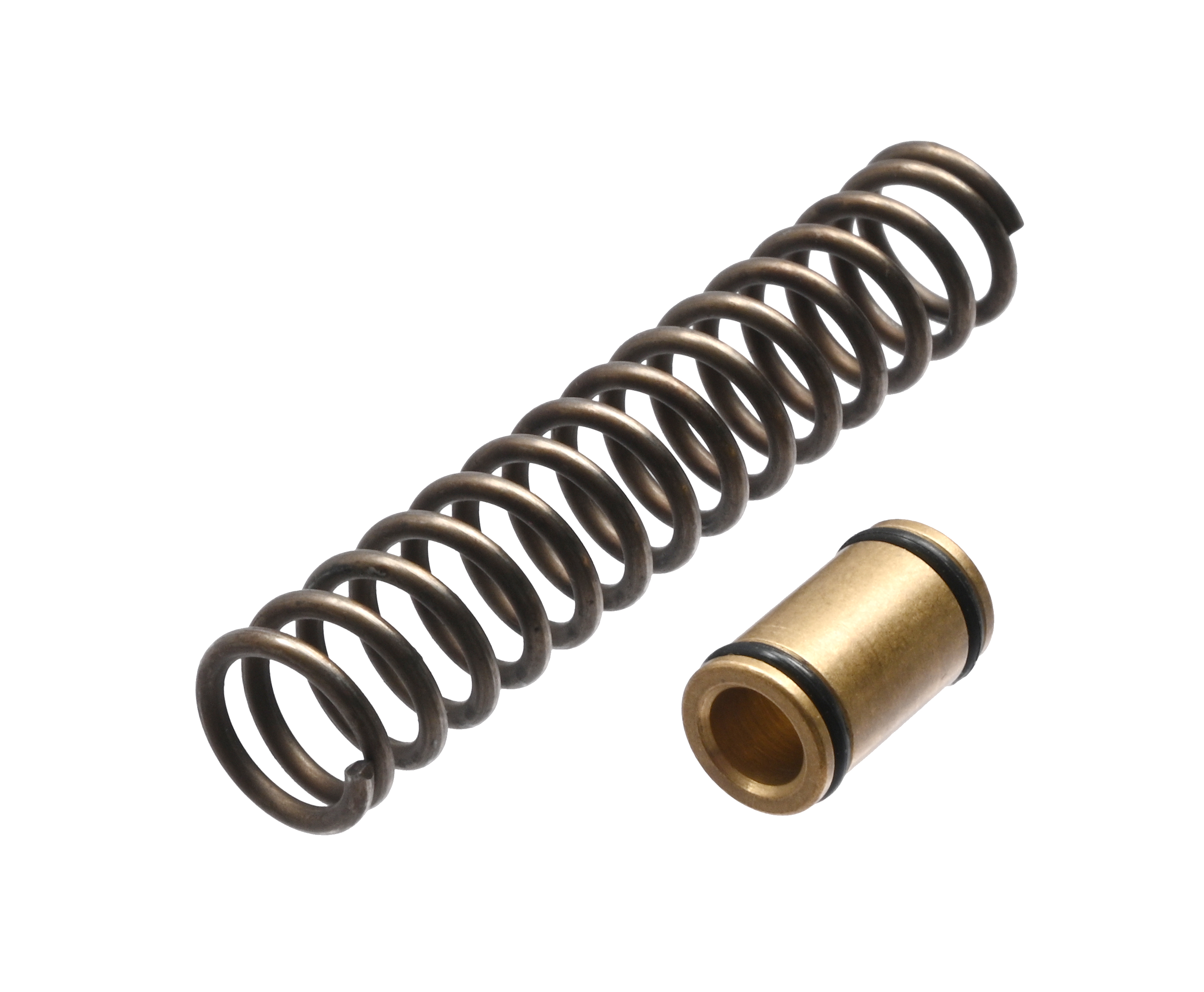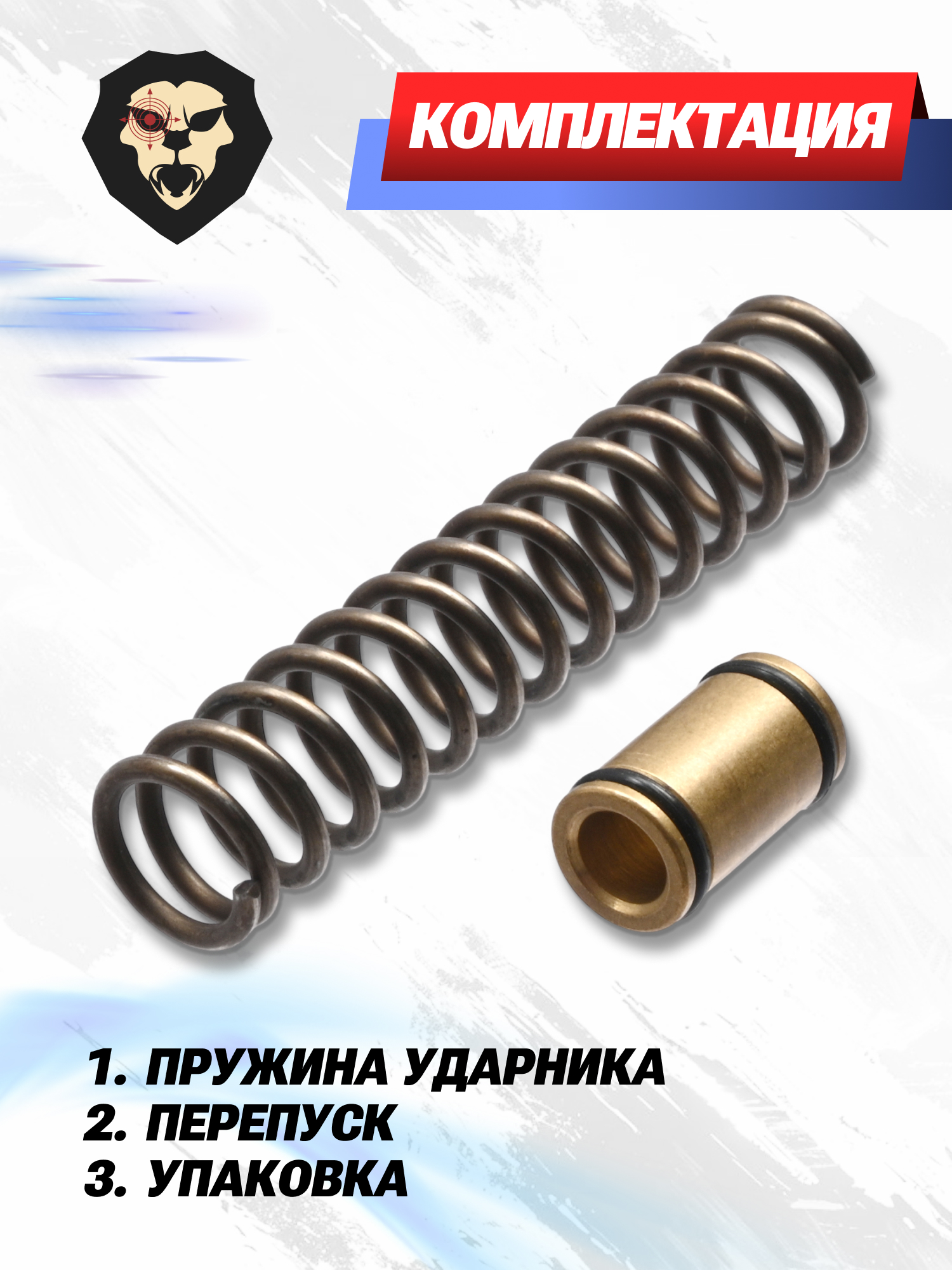 Перепуск вытачивается из латунной заготовки и при внешнем диаметре 10 мм характеризуется наличием внутреннего канала 6 миллиметров. Пружина из набора усилена - она изготавливается из утолщенной стальной проволоки 1.5 мм, которая после процедуры закаливания приобретает повышенную устойчивость к эффекту усадки, ввиду чего не теряет рабочих качеств при большом настреле. Все детали устанавливаются на штатные посадочные места совместимых винтовок без потребности в дополнительных доработках.