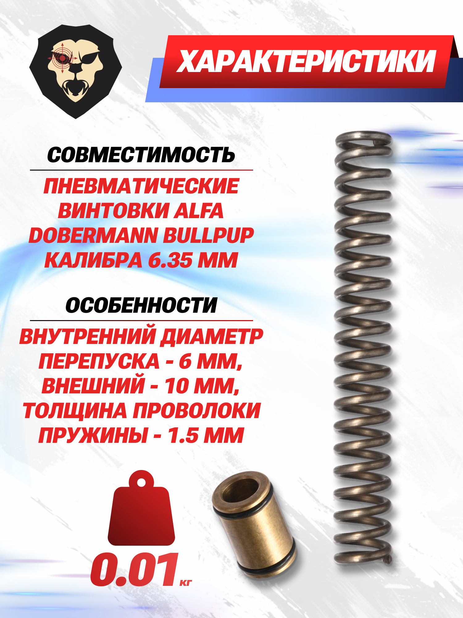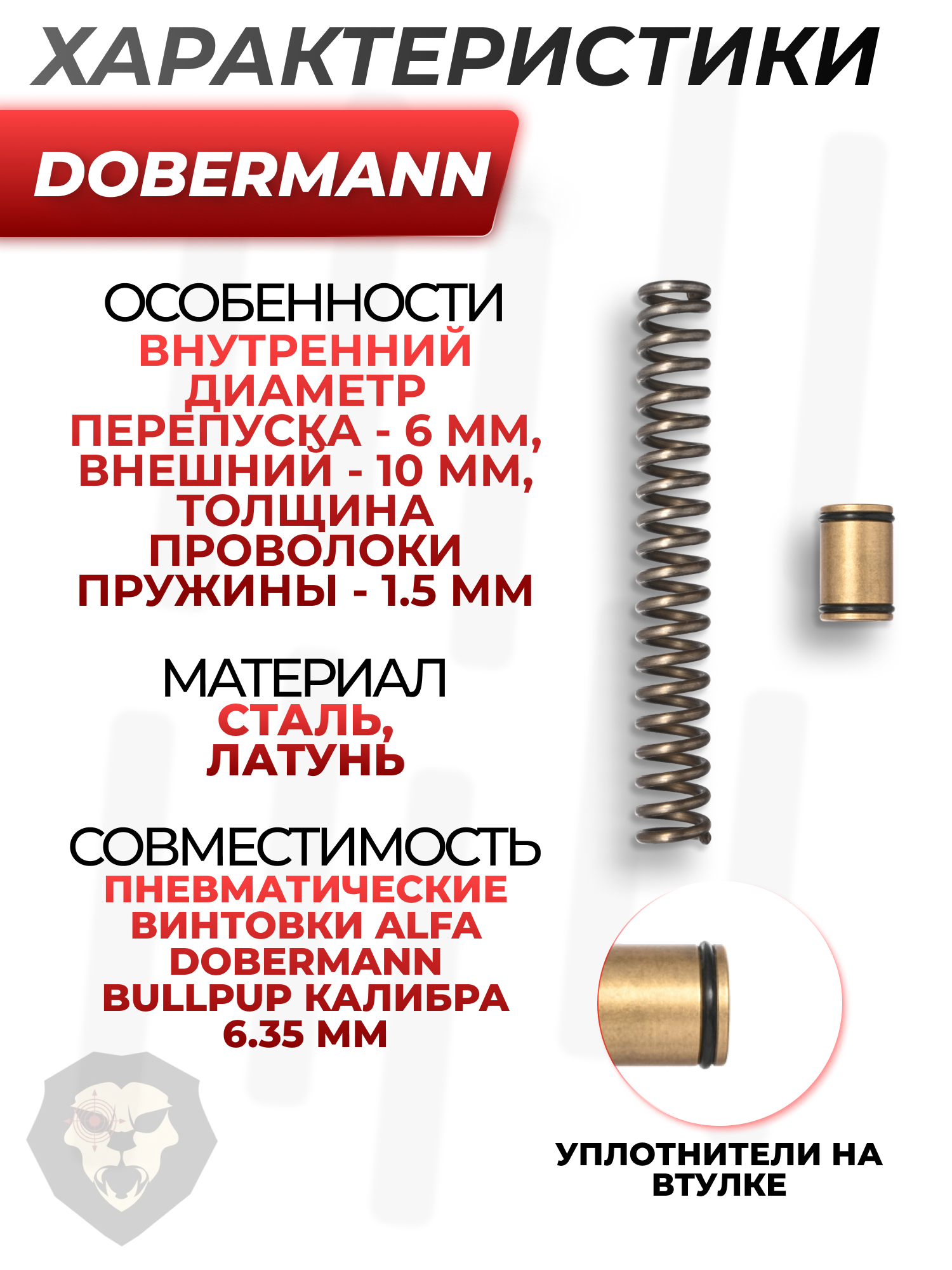 Представленный комплект предназначается для установки в винтовки серии Альфа Доберман БуллПап 6.35 мм. Он включает пружину ударника, отвечающую за раскрытие боевого клапана, и втулку перепуска с увеличенным проходным отверстием. Указанные узлы рассчитаны специально для стрельбы полнотелыми тяжелыми боеприпасами указанного калибра.